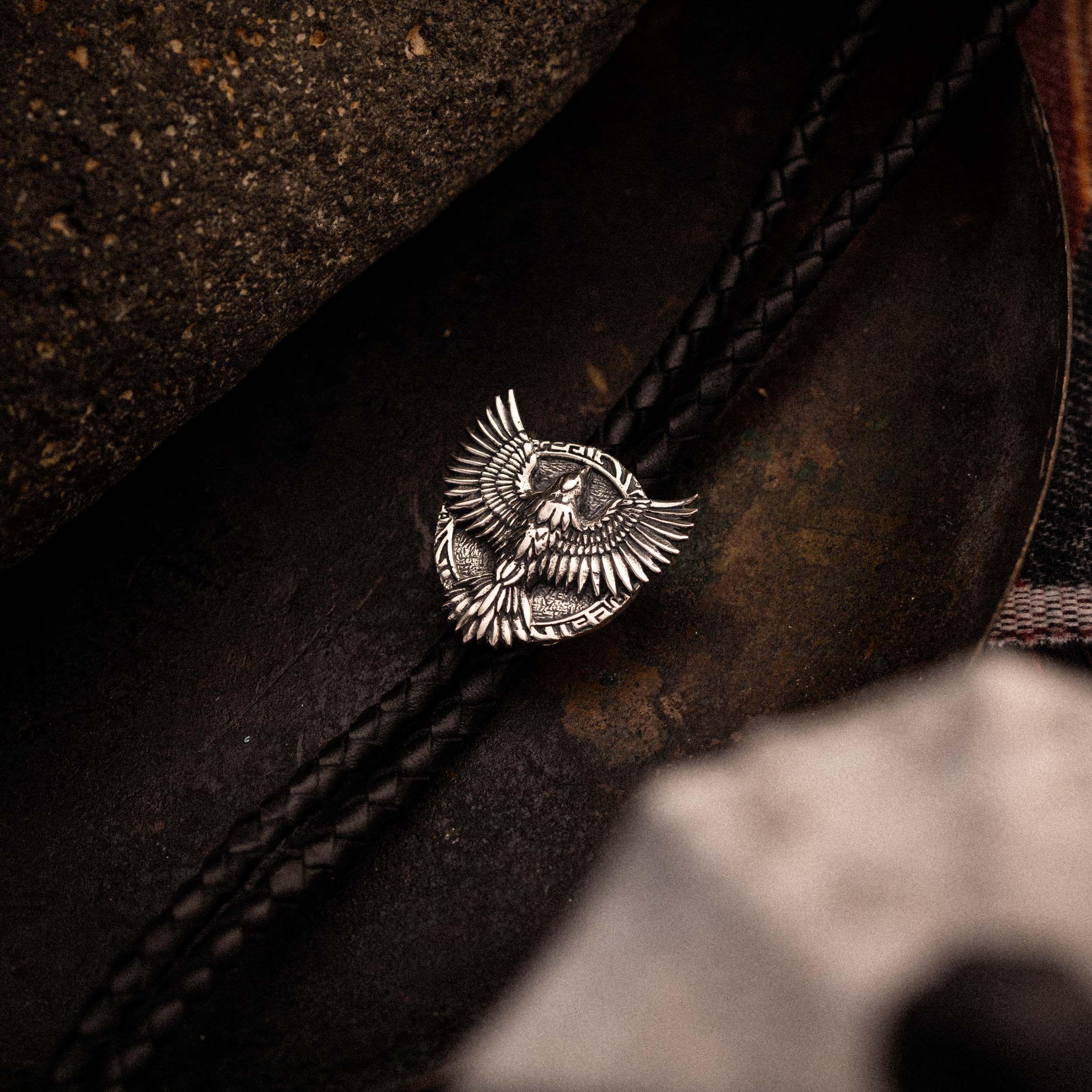 Raven’s Feather Bolo Tie: Leather worn soft, silver carved to guide, like a shadow that never leaves.