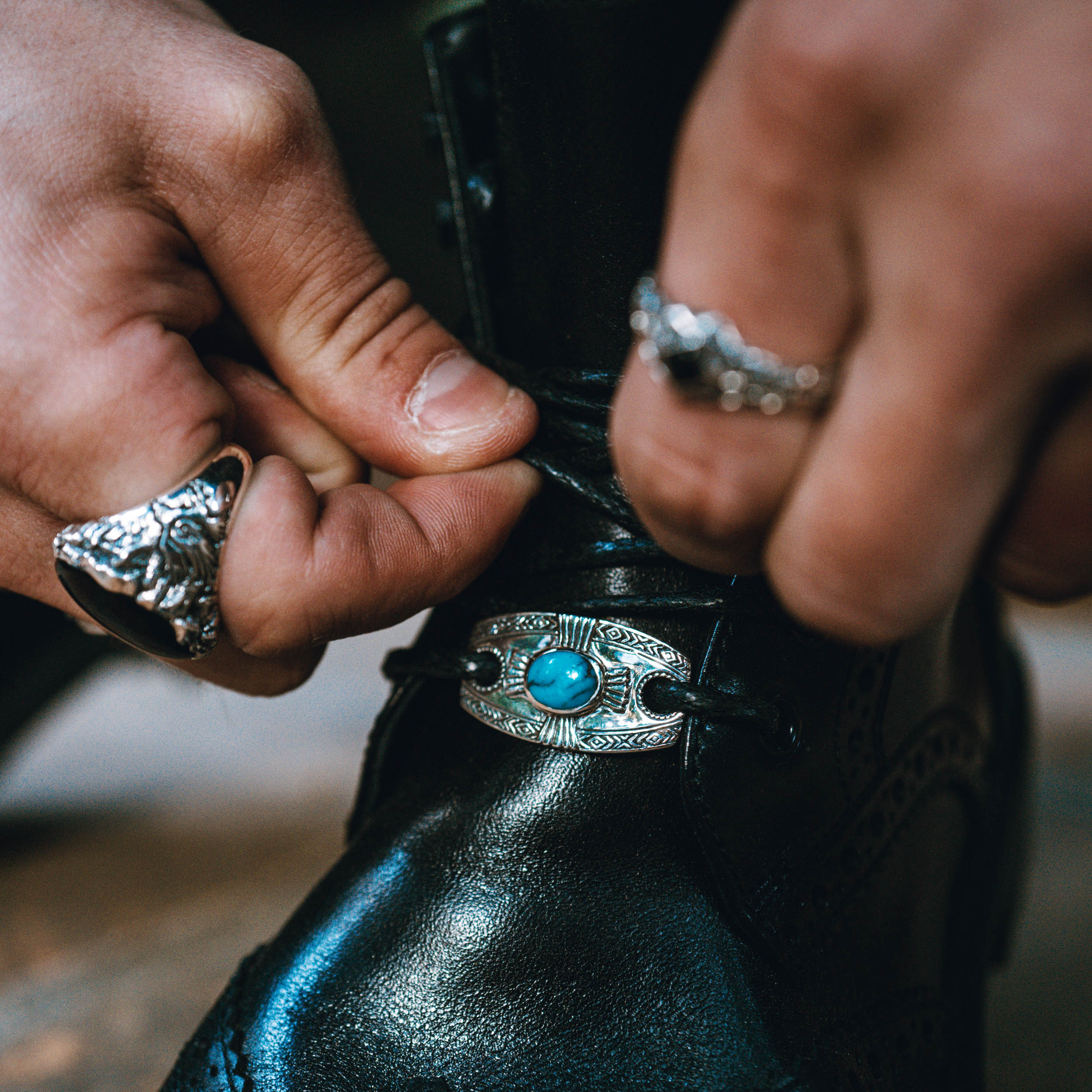 Storm Rider Boot Tags: Stabilized turquoise stones flashing like lightning, built for the ones who ride into the storm.