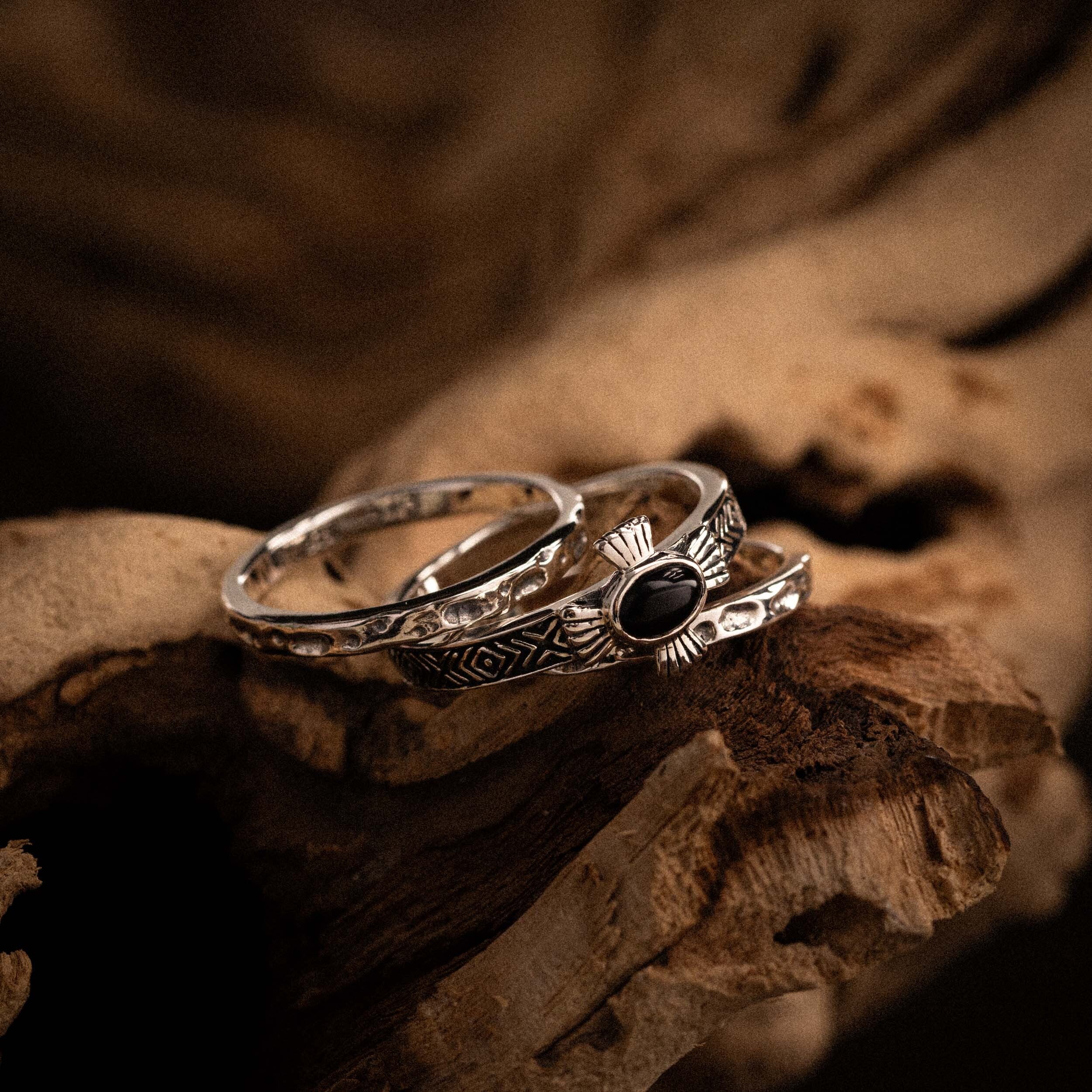 Hermandad came together the way the best things do — between friends, across time, with nothing forced. It started in Iceland, where JJ Julius Son was raised in cold winds and heavy skies. That path led him to Nashville, where he found soul, grit, and roads that seemed to stretch forever. These pieces hold both worlds in their weight: carved runes and black stones for the North, turquoise and leather for the South. A mix of styles as intentional and as heavy as his music.