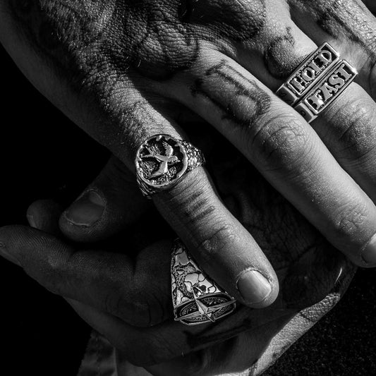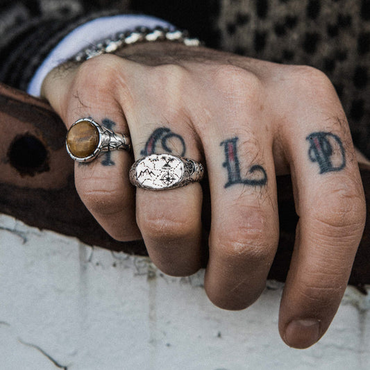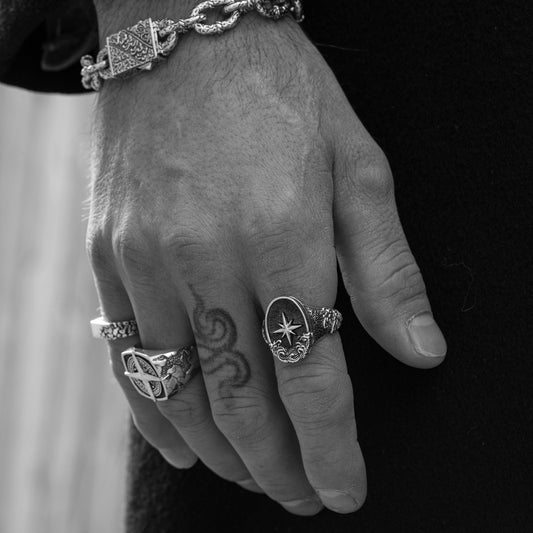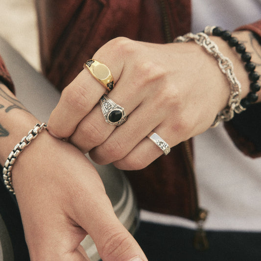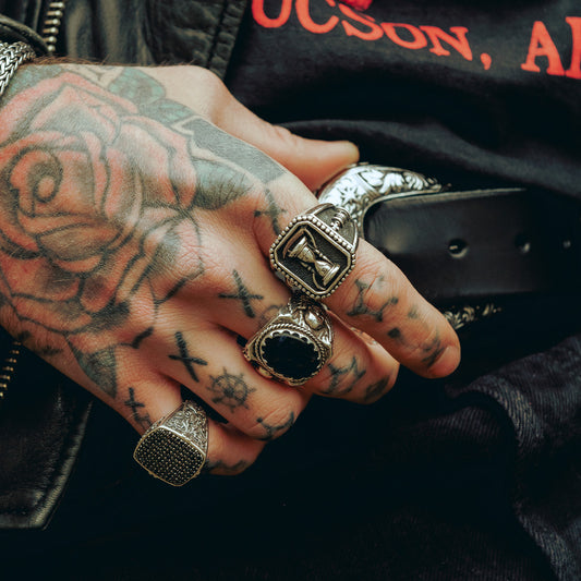 Our signet rings for men pull inspiration from ancient seals, nautical markings, biker history, and the symbols carried by wanderers and outliers. If you want something clean, a men's silver signet ring brings minimal weight with an unmistakable edge. If you want more story, designs like our onyx-inlaid styles deliver that striking contrast that only a real onyx signet ring for men design can offer.