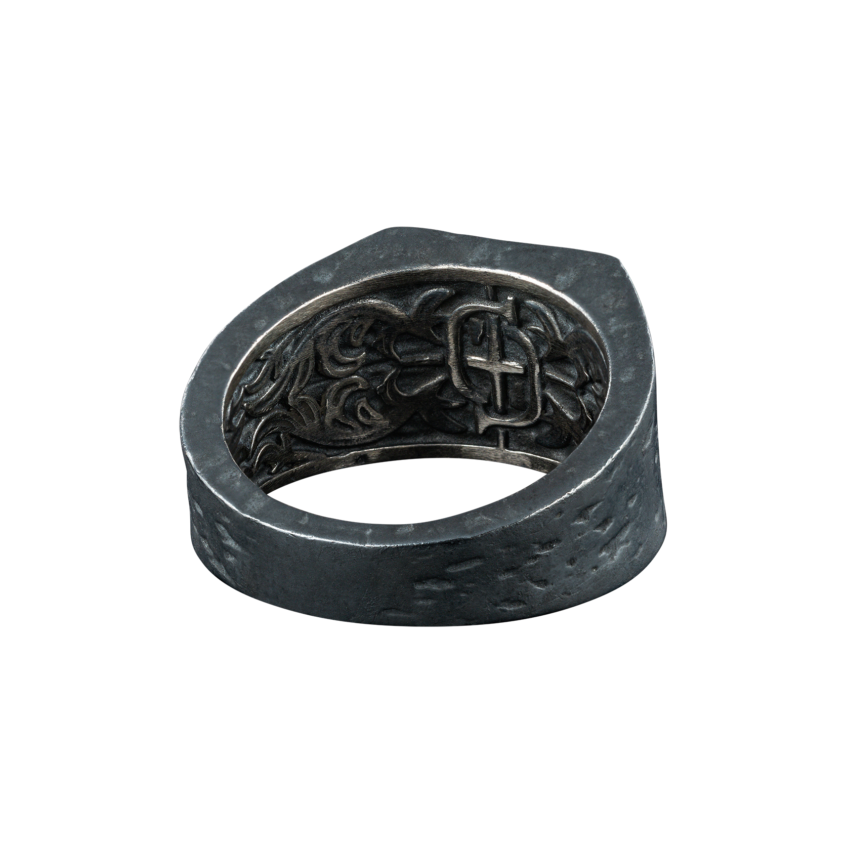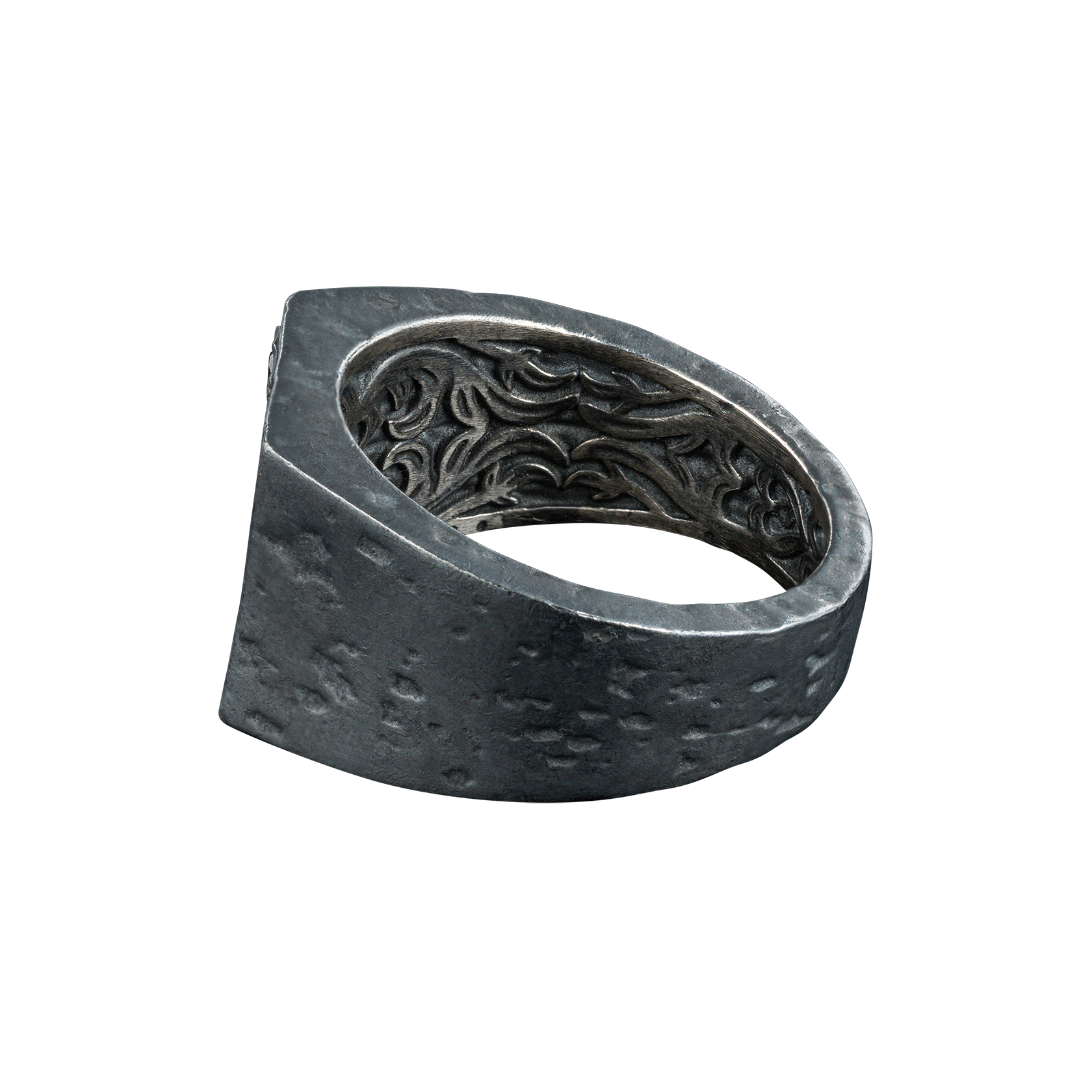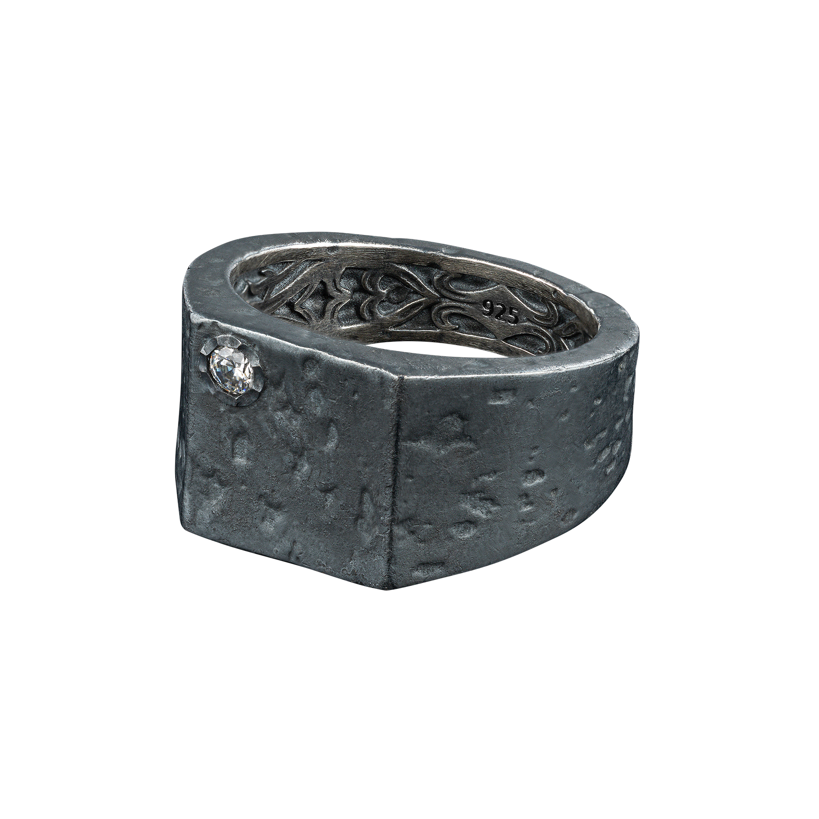 Bubbling deep below the surface of the earth, rivers of magma sit at the ready, waiting for a volcanic eruption. These powerful explosions have the capacity to wipe out almost everything in their path, covering neighbouring lands with molten lava. The rough texture of the Cinder ring is inspired by the fragments of solidified lava found near these deadly sites, while a single diamond serves as a symbol of new beginnings—even the harshest situations can be overcome by those who carry a fire inside them.