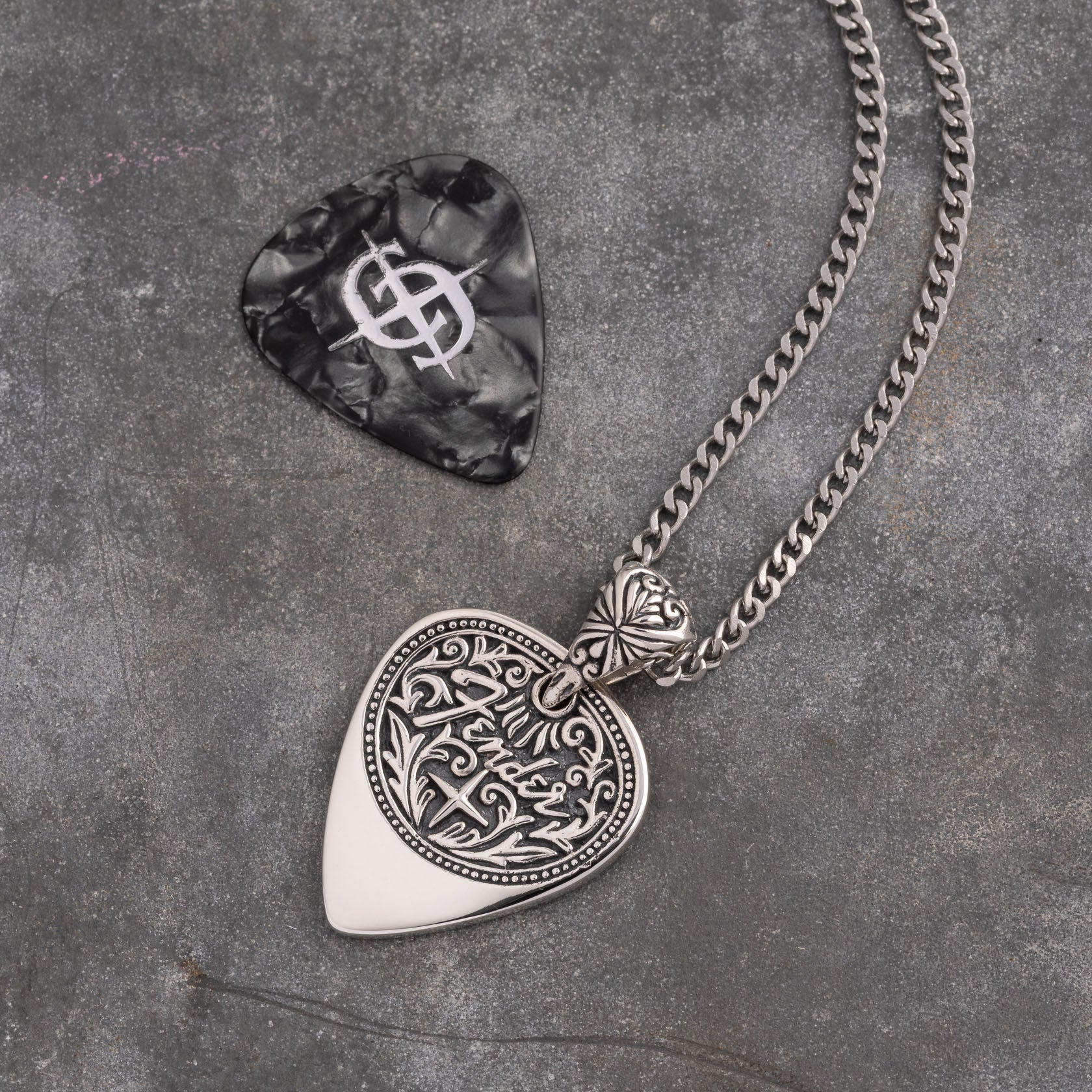 Designed in collaboration with revolutionary guitar makers Fender. The Plectrum pendant serves as a symbol of the passion poured into a musician’s craft over countless hours of slapping the strings. A token of the triumphs and sacrifices made on the road to perfection