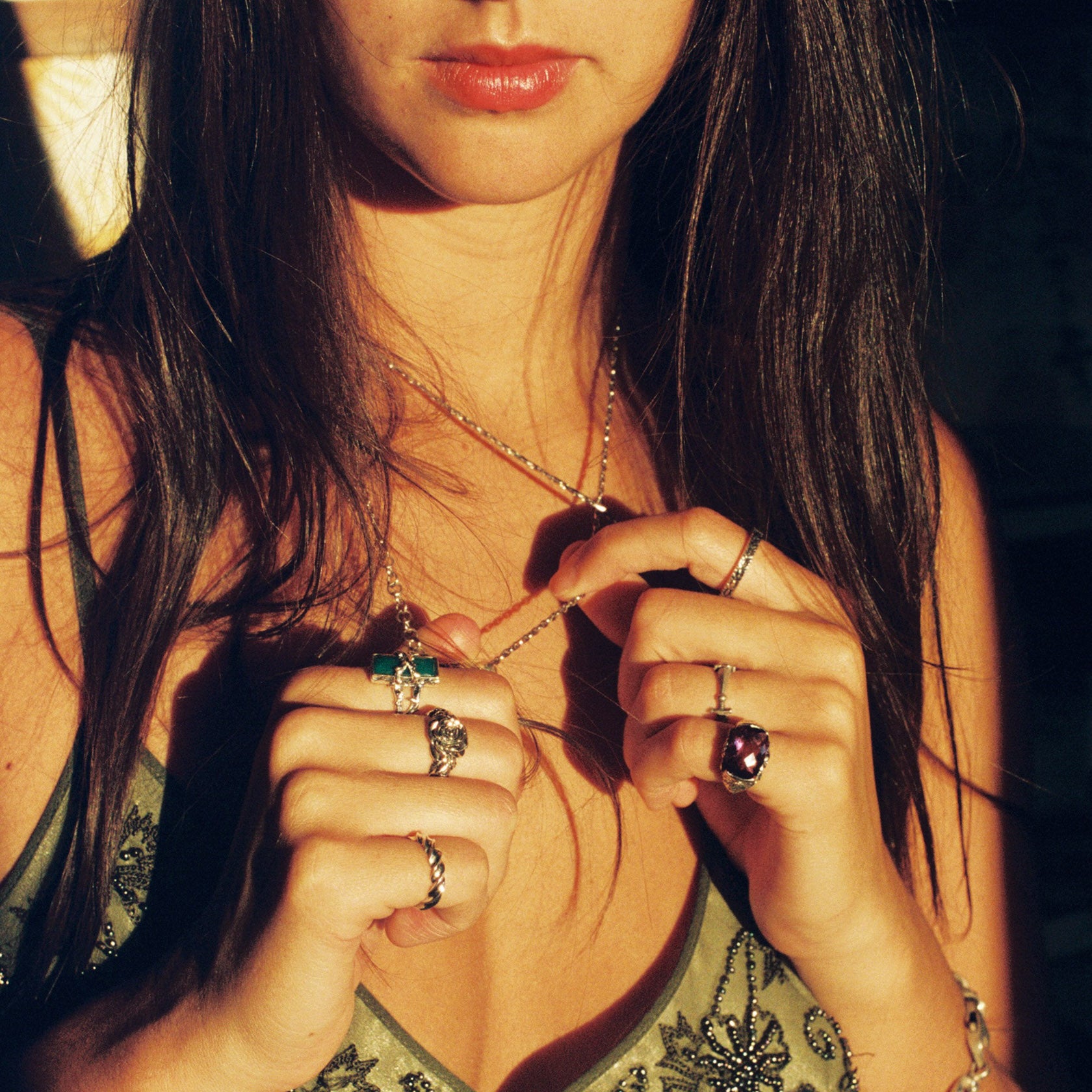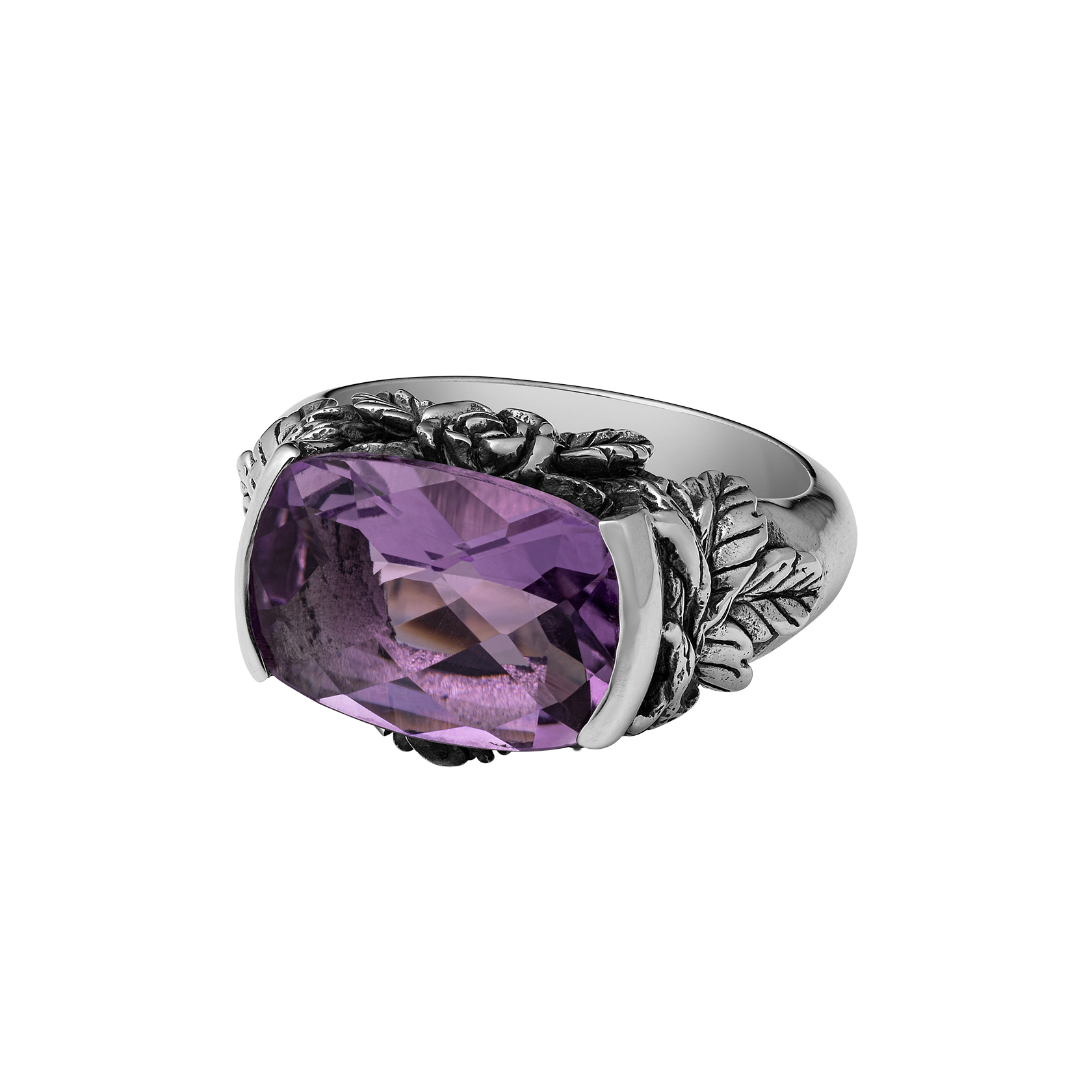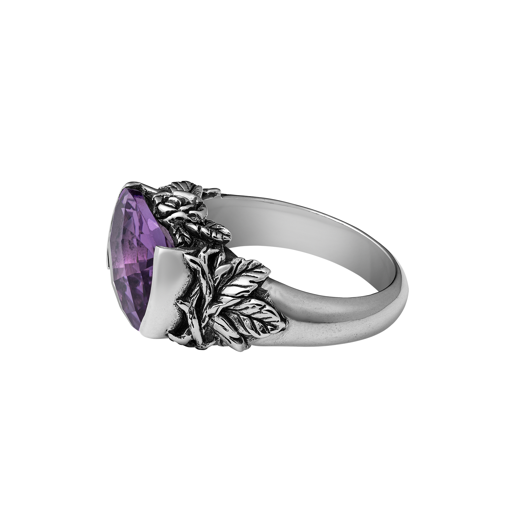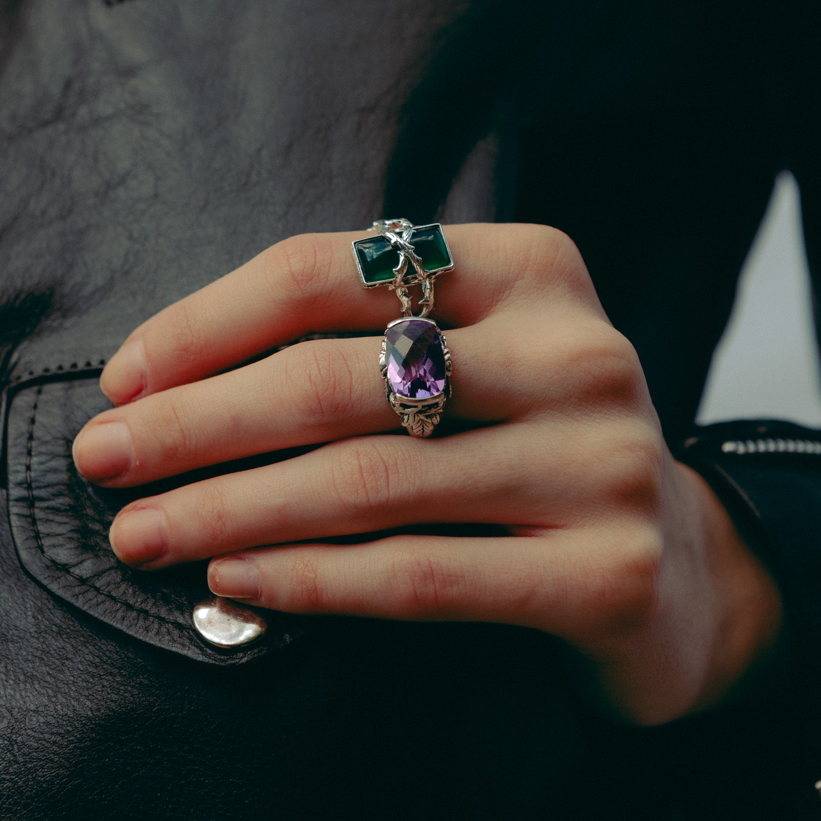 The Bewitched ring holds a cushion-cut amethyst, set atop a luxurious bed of roses. This piece is for those drawn to the mystical and unknown, capturing a spellbinding allure that’s as enchanting as the wearer. A touch of mystery wrapped in deep purple elegance.