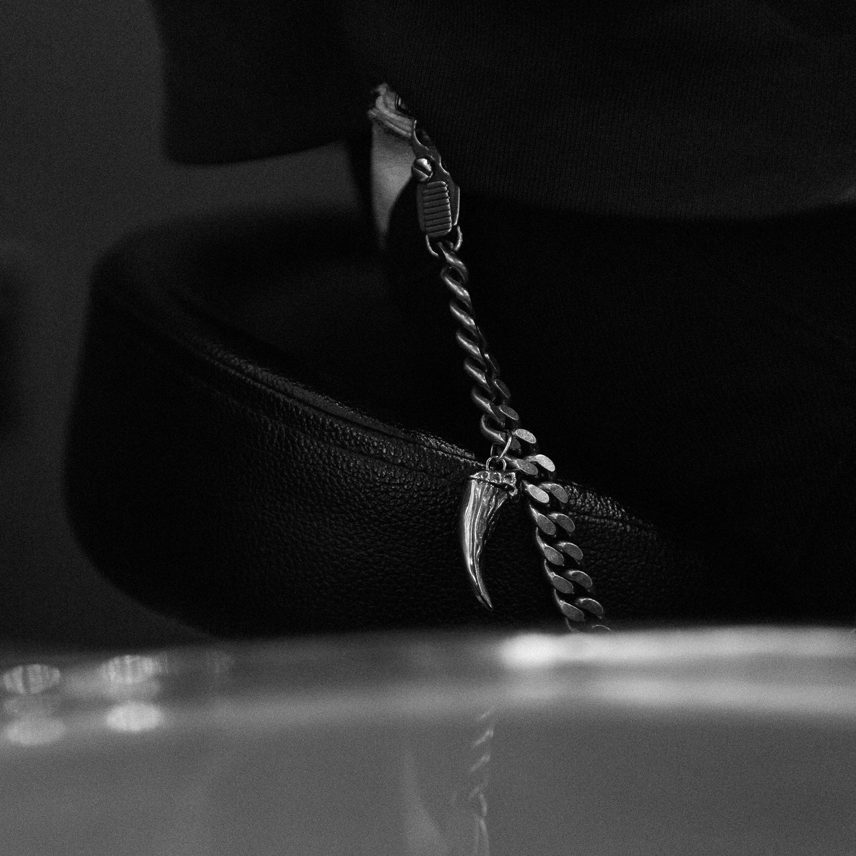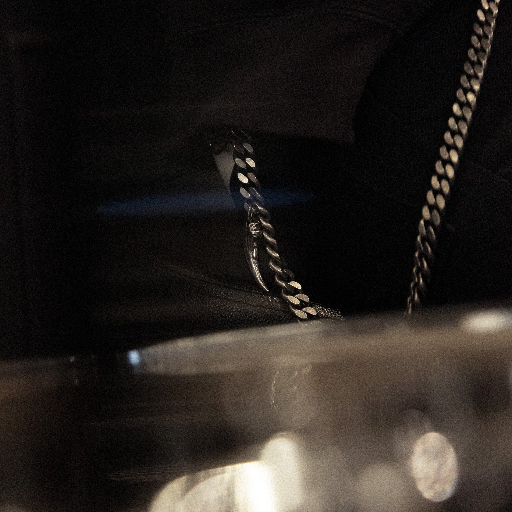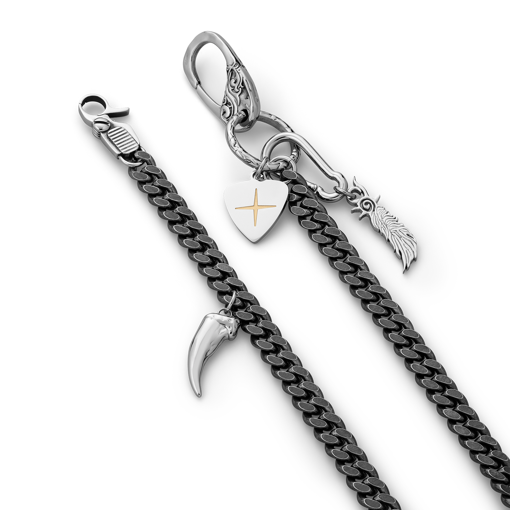 Over a year in the works, Orphan is the result, a wallet chain forged from solid stainless steel and loaded with meaning. A guitar pick for the noise. A feather for the faith. A wolf tooth for the chaos that shaped him.