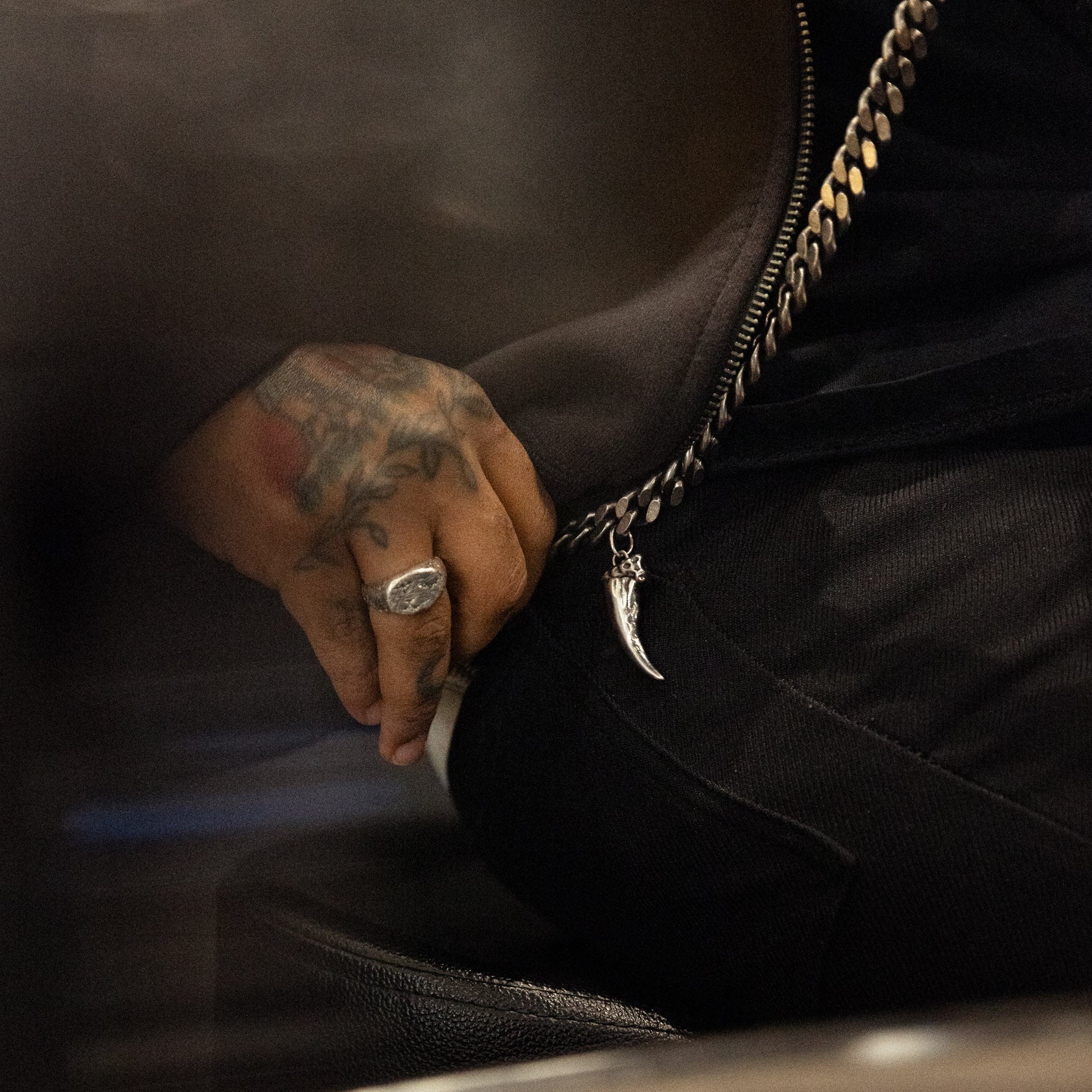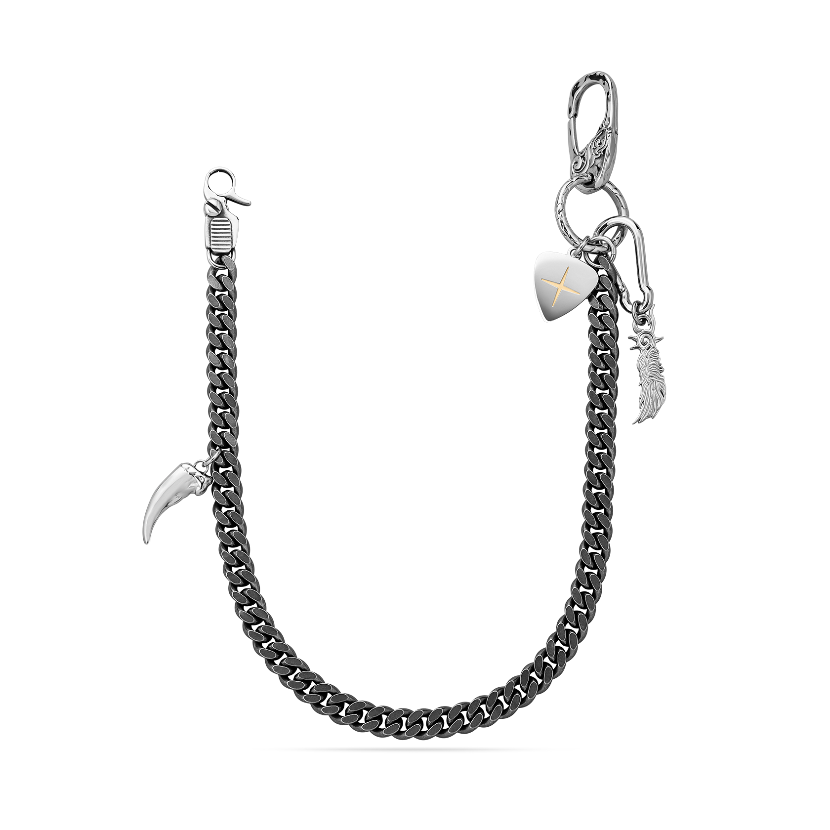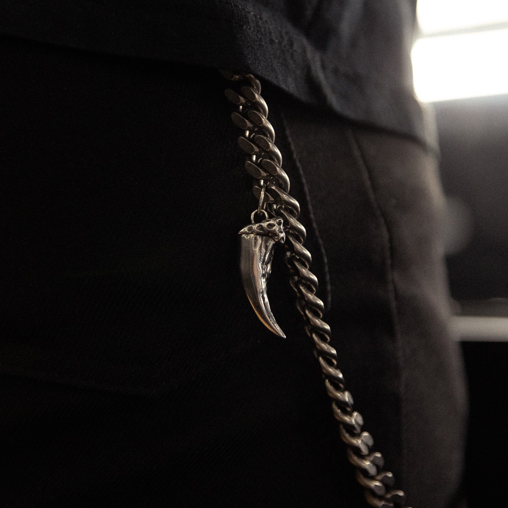 Over a year in the works, Orphan is the result, a wallet chain forged from solid stainless steel and loaded with meaning. A guitar pick for the noise. A feather for the faith. A wolf tooth for the chaos that shaped him.
