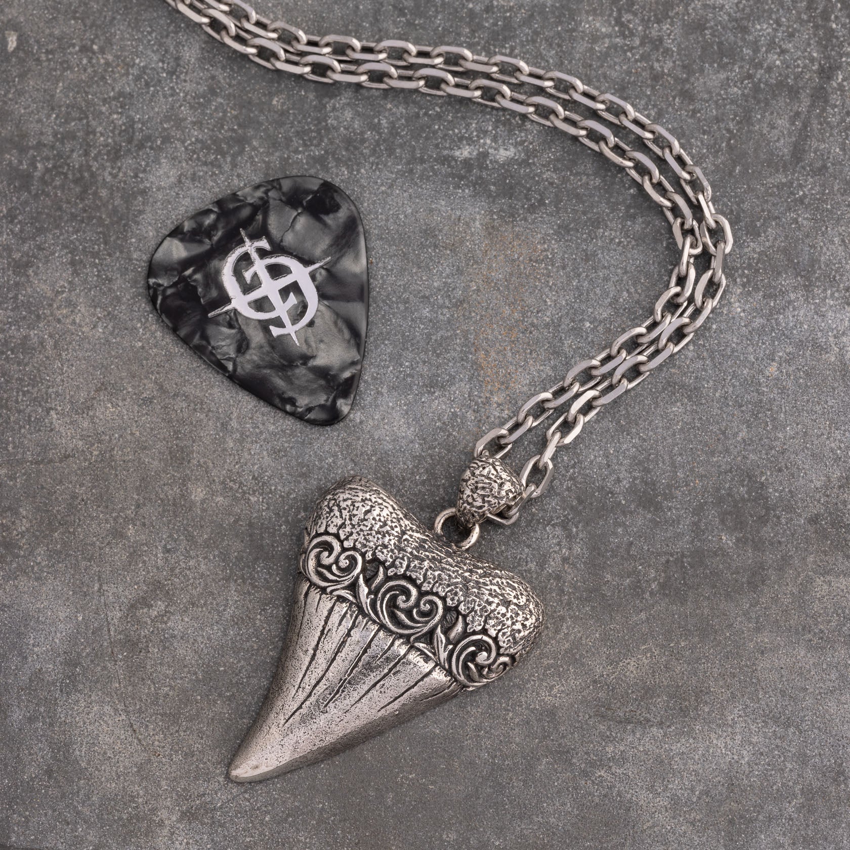 Taking the shape of a classic shark tooth pendant, the double-sided Blood in The Water is inspired by the raw power and sleek elegance of the ocean's most notorious hunter.