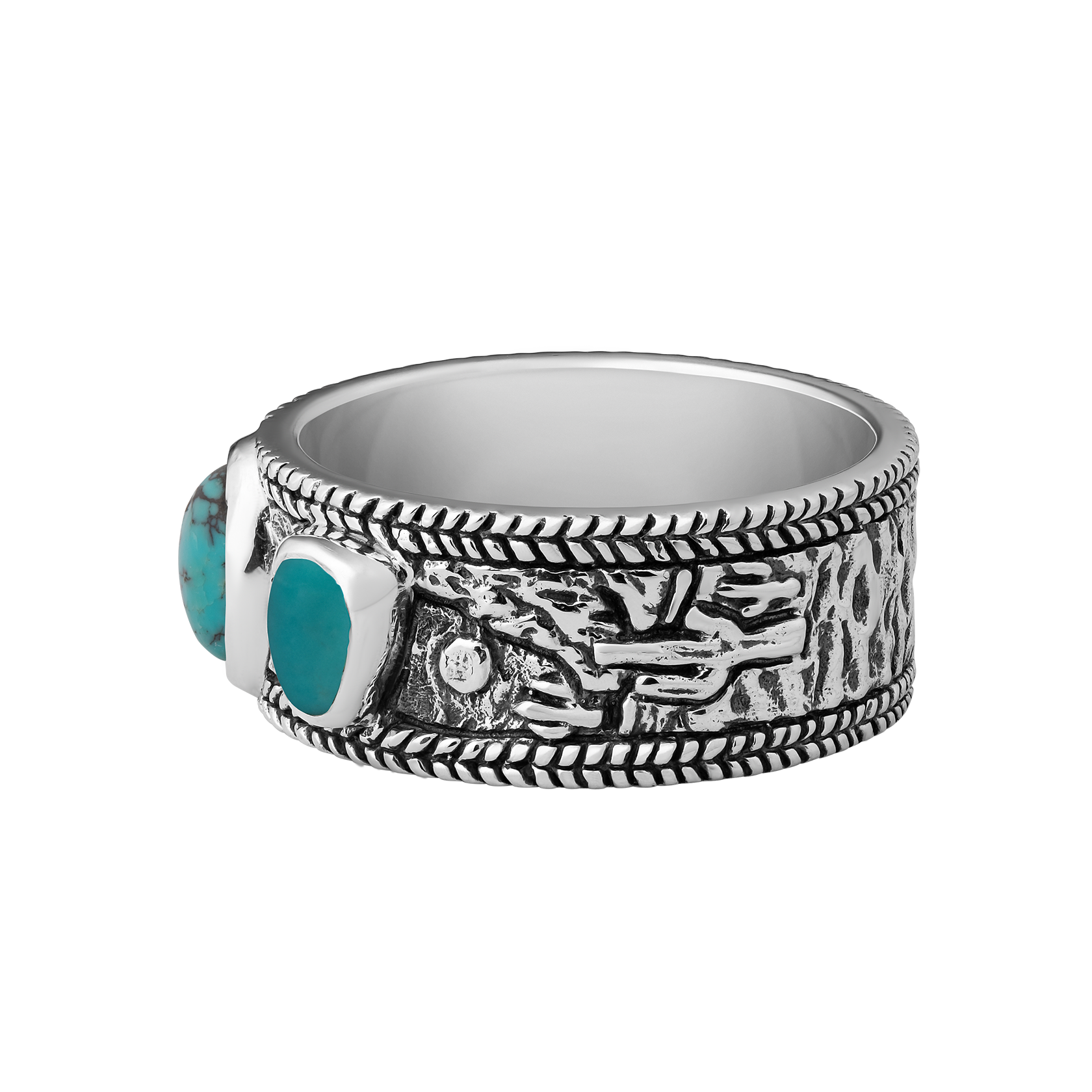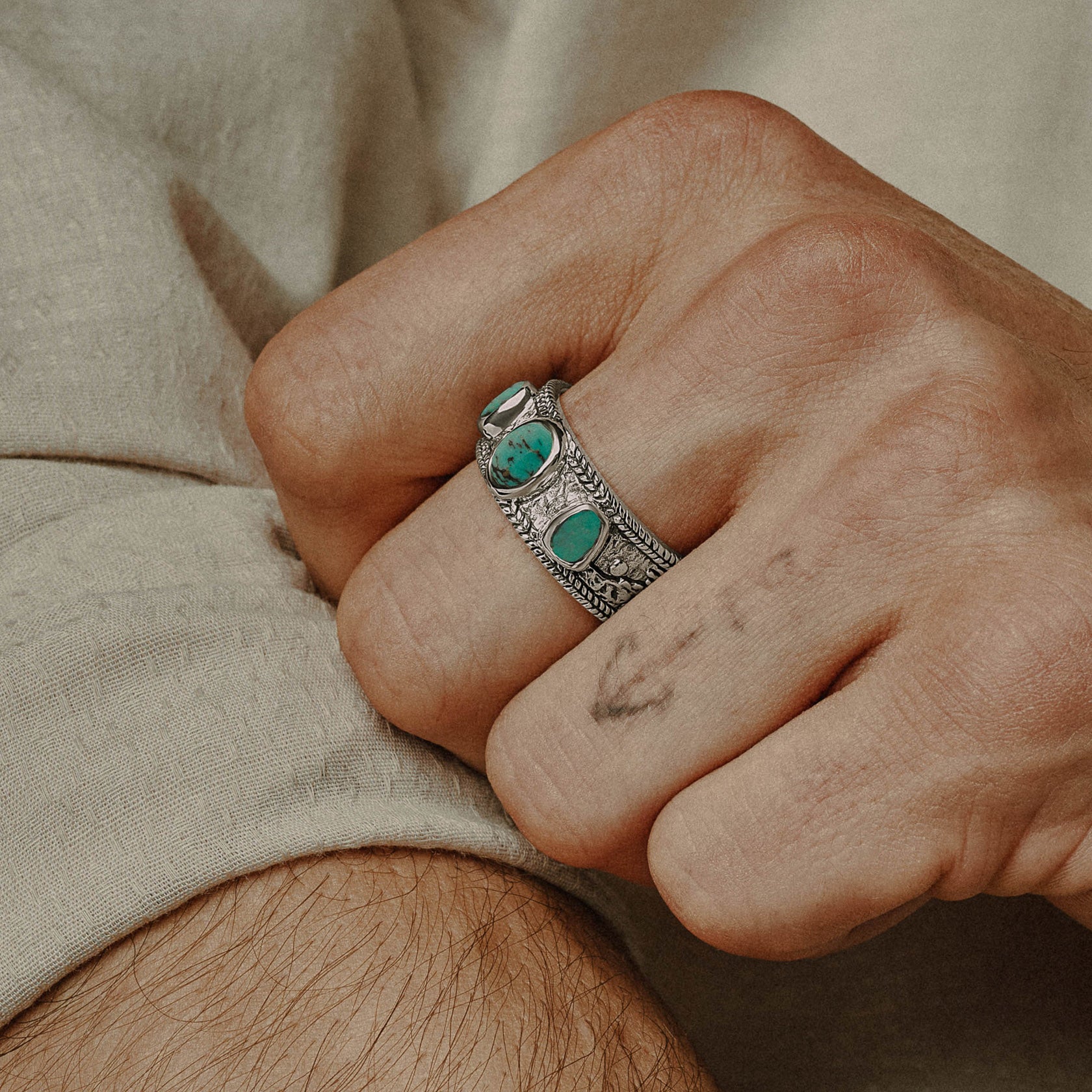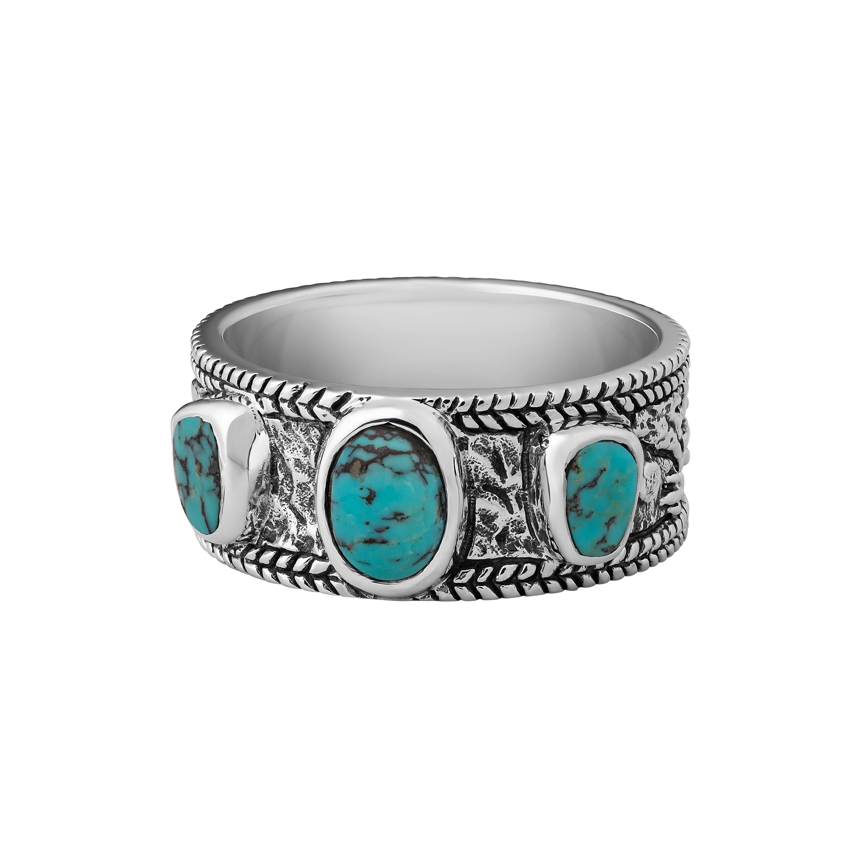 Designed in collaboration with Peter McKinnon, the Horizon captures the expansive beauty of the western landscape. This sterling silver ring features three uniquely shaped turquoise stones, set against a backdrop of an intricately engraved rugged western panorama that wraps around the surface of the band.