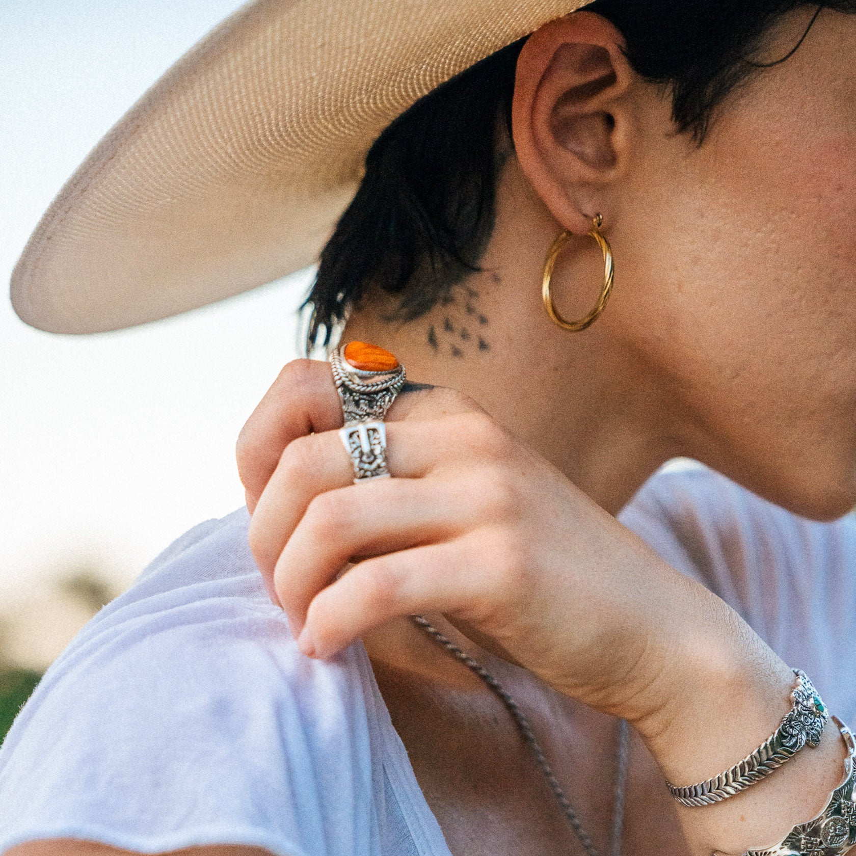 Our jewelry is cast from .925 sterling silver and surgical-grade stainless steel, rigorously tested for purity, strength, and longevity. We source real, ethically mined stones for their texture and natural character, setting each one by hand to lock in both beauty and durability.