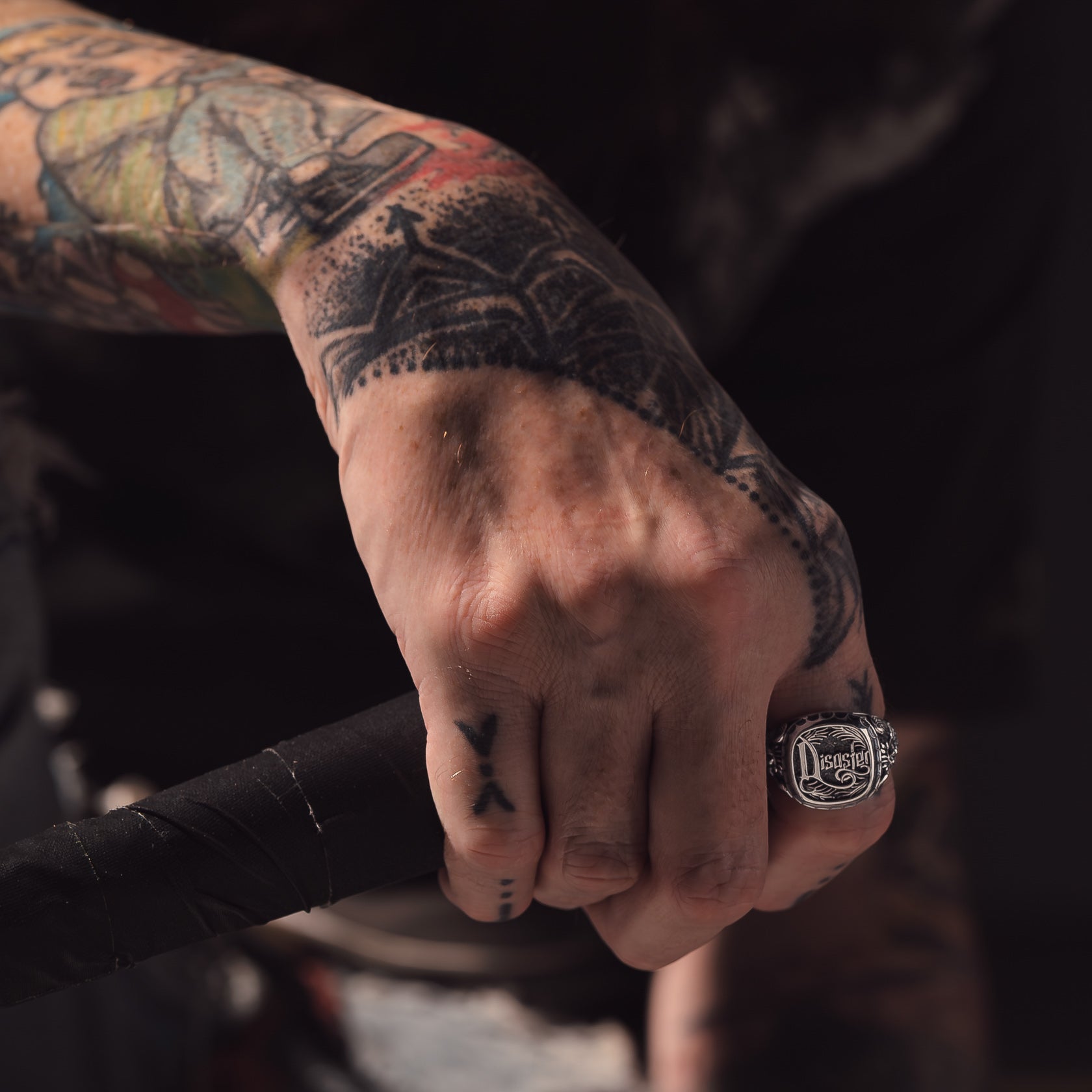 The minute I saw the release of the Disaster x Maylene, I realized it would compliment the praying angels on the sides of my Ascent ring. Best thing was that it was offered by Clocks + Colours. Recently I purchased several "sterling" silver rings only to find the finish poor and the inside of the ring hollowed out to save on the "silver". Meanwhile, every ring I've purchased from C+C has been the finest quality from Watery Grave to the Tempus. The only problem I had was the sizing in one ring and they remedied that immediately. Disaster now sits on my index finger daily!