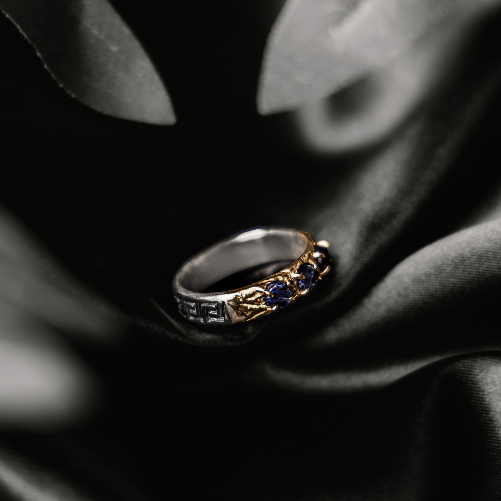The Hermes stacking ring set brings together the essence of Greek artistry and timeless style. Crafted in sterling silver with brass inlays, each ring features distinct Greek patterns —  with intricate vine details, classic scrollwork and the traditional Greek key. Accented with blue pietersite, known for their protective qualities, this set captures the spirit of ancient artistry with a modern twist, making it a versatile addition to any collection.