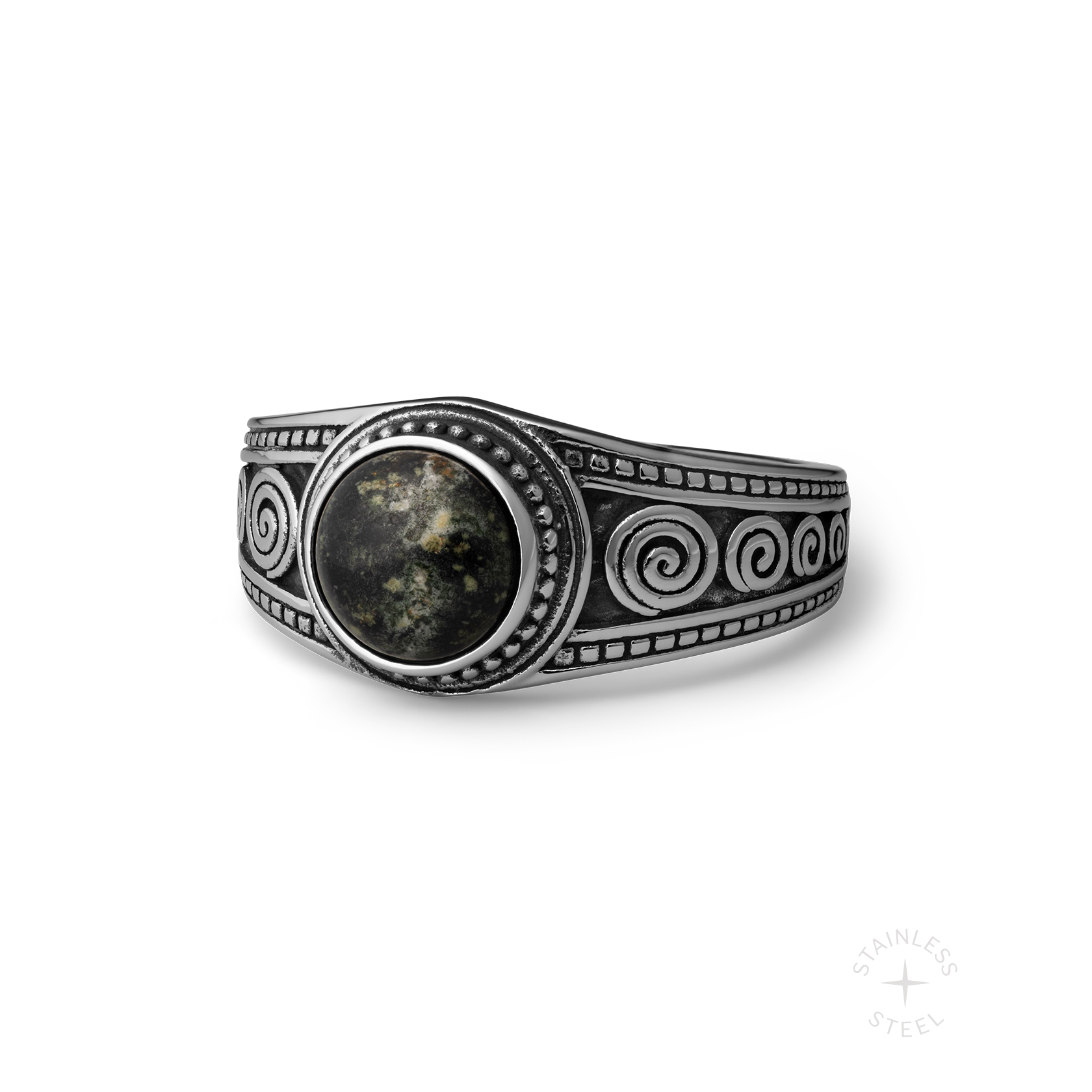 Stainless steel ring with Kambaba Jasper stone. Ring band features carved patterns, inspired by Greek art and architecture.