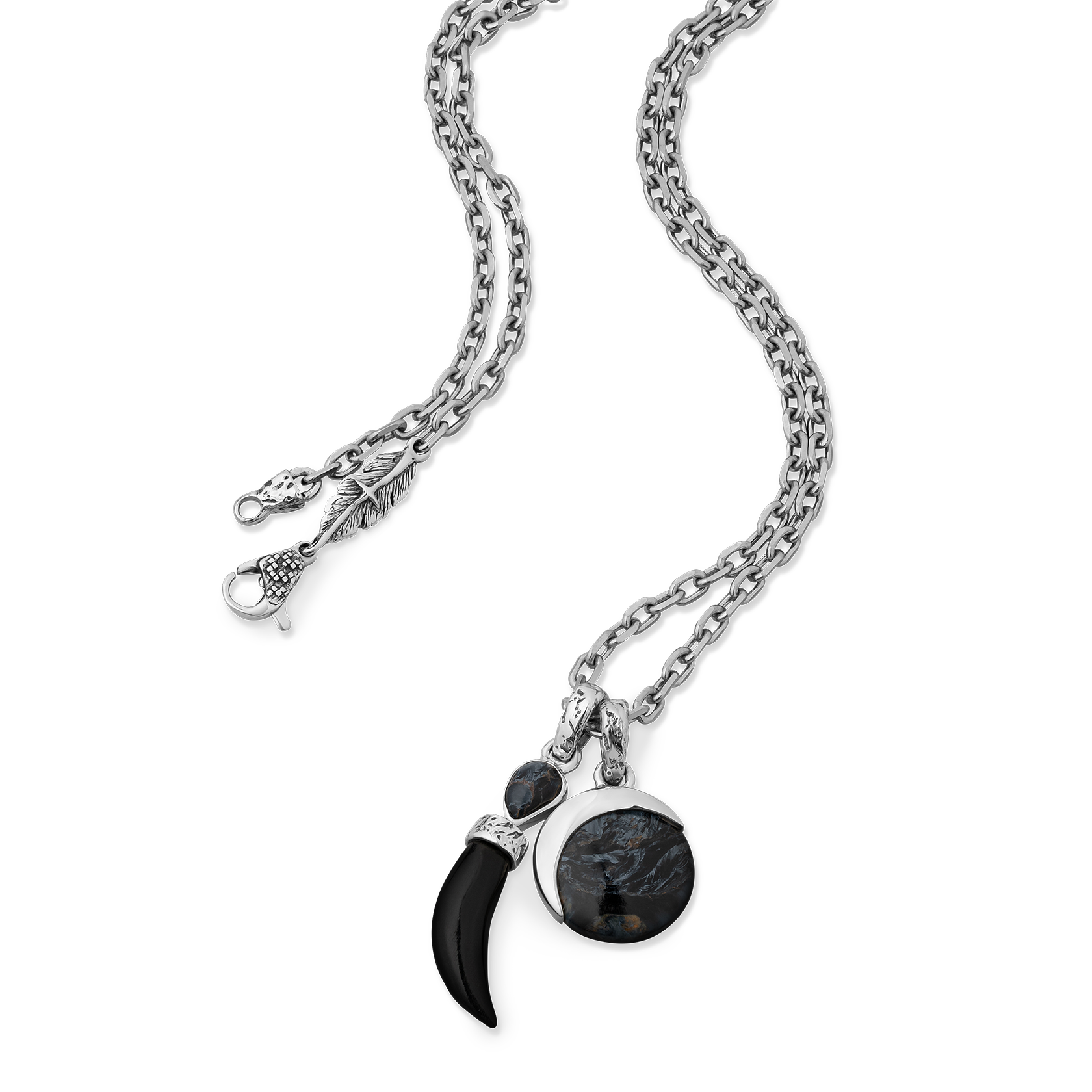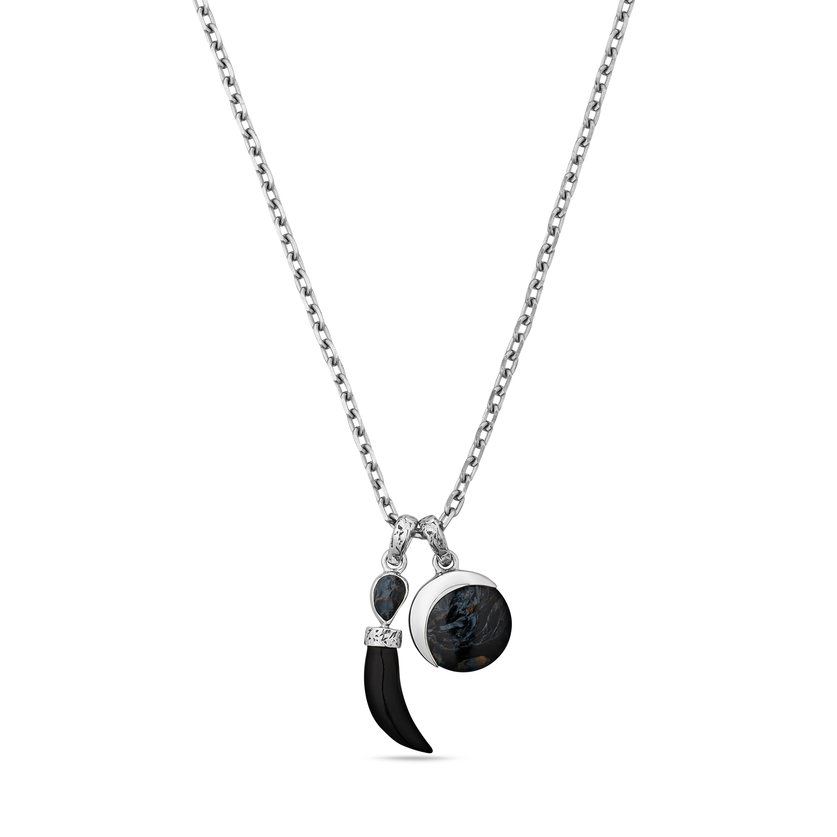 Handcrafted Sterling Silver pendants with Blue Pietersite stone and Buffalo horn. Comes on a 55cm long x 3cm thick stainless steel chain.
