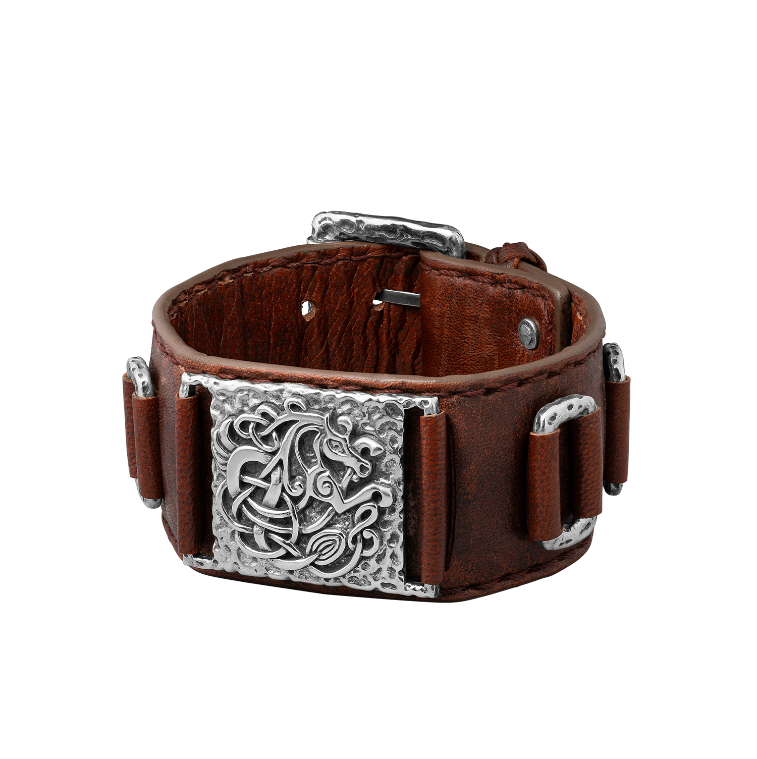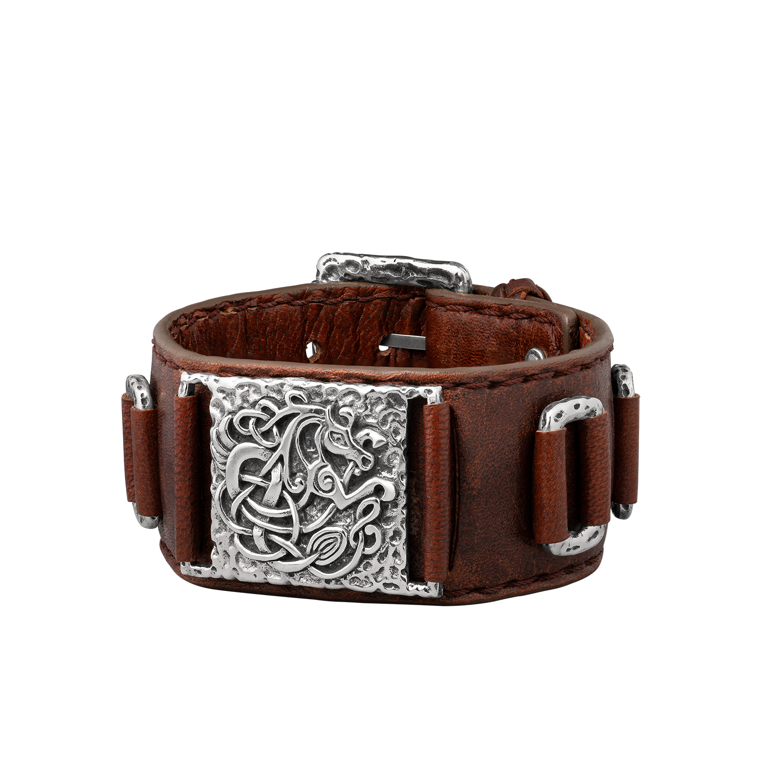 Leather thick and worn from long days. A single horse carved in celtic runes rides steady on silver hardware — a quiet reminder that strength comes from showing up, again and again.