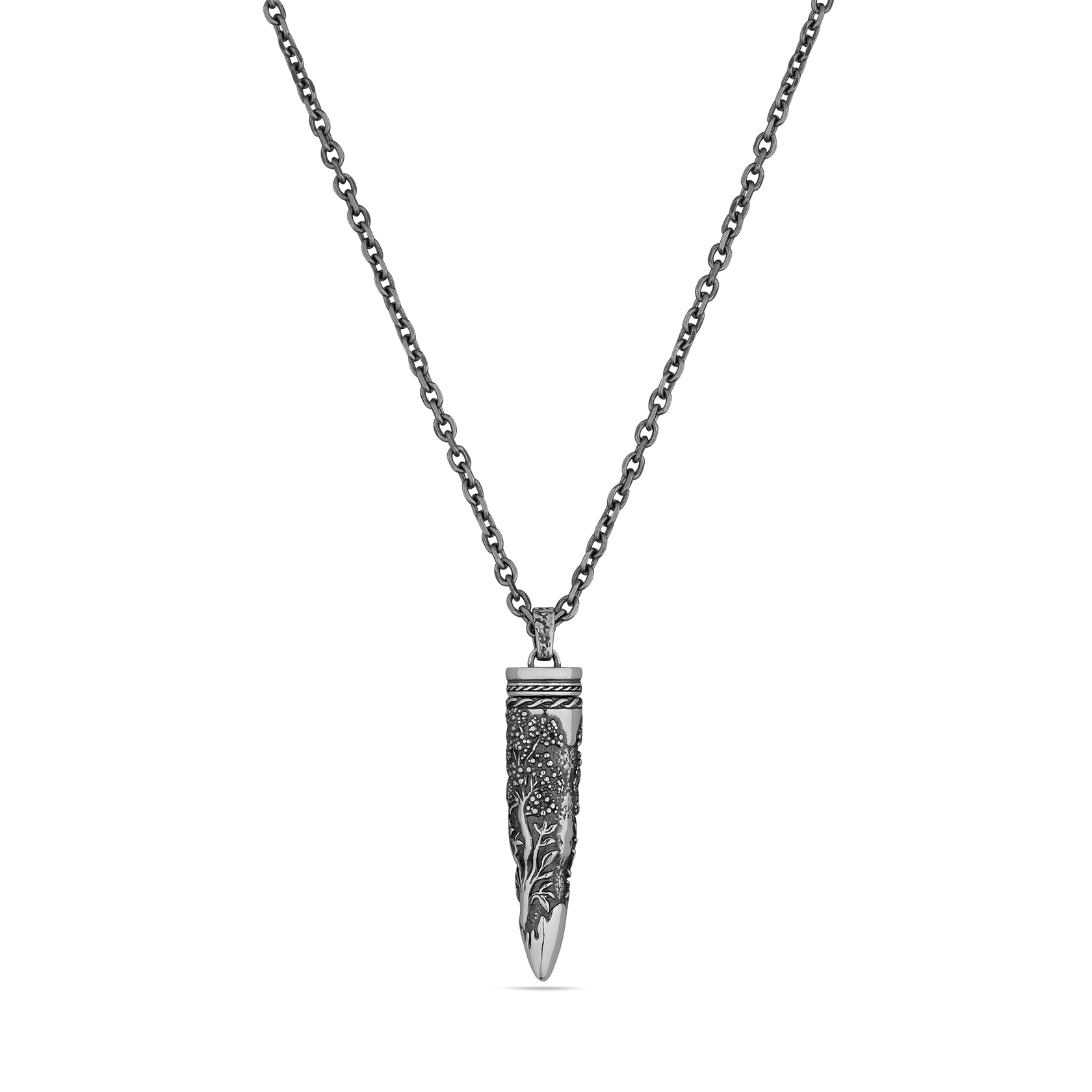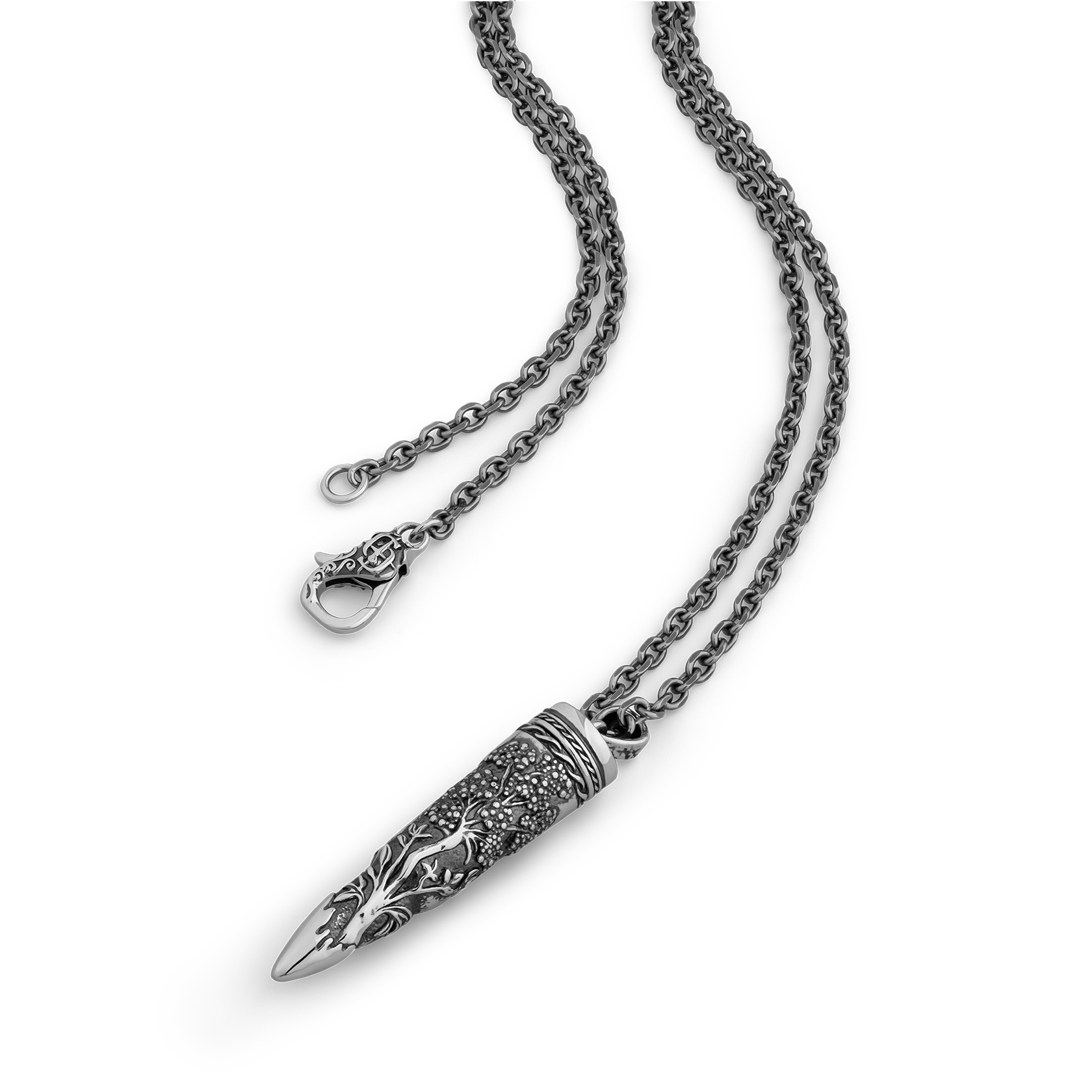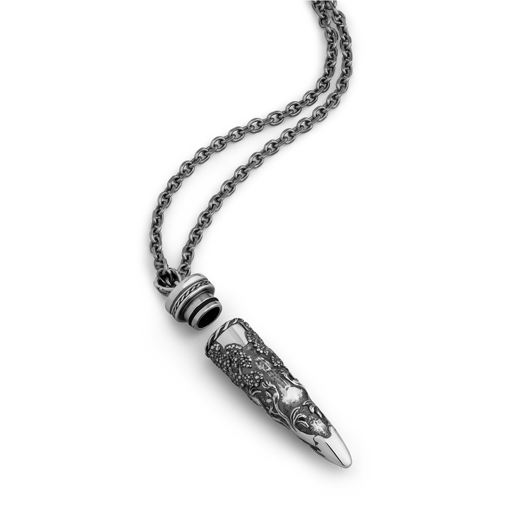 Handcrafted Sterling Silver pendant on a 55cm long x 3mm thick Stainless Steel chain necklace with custom Sterling Silver clasp. The top comes off to reveal a small container.