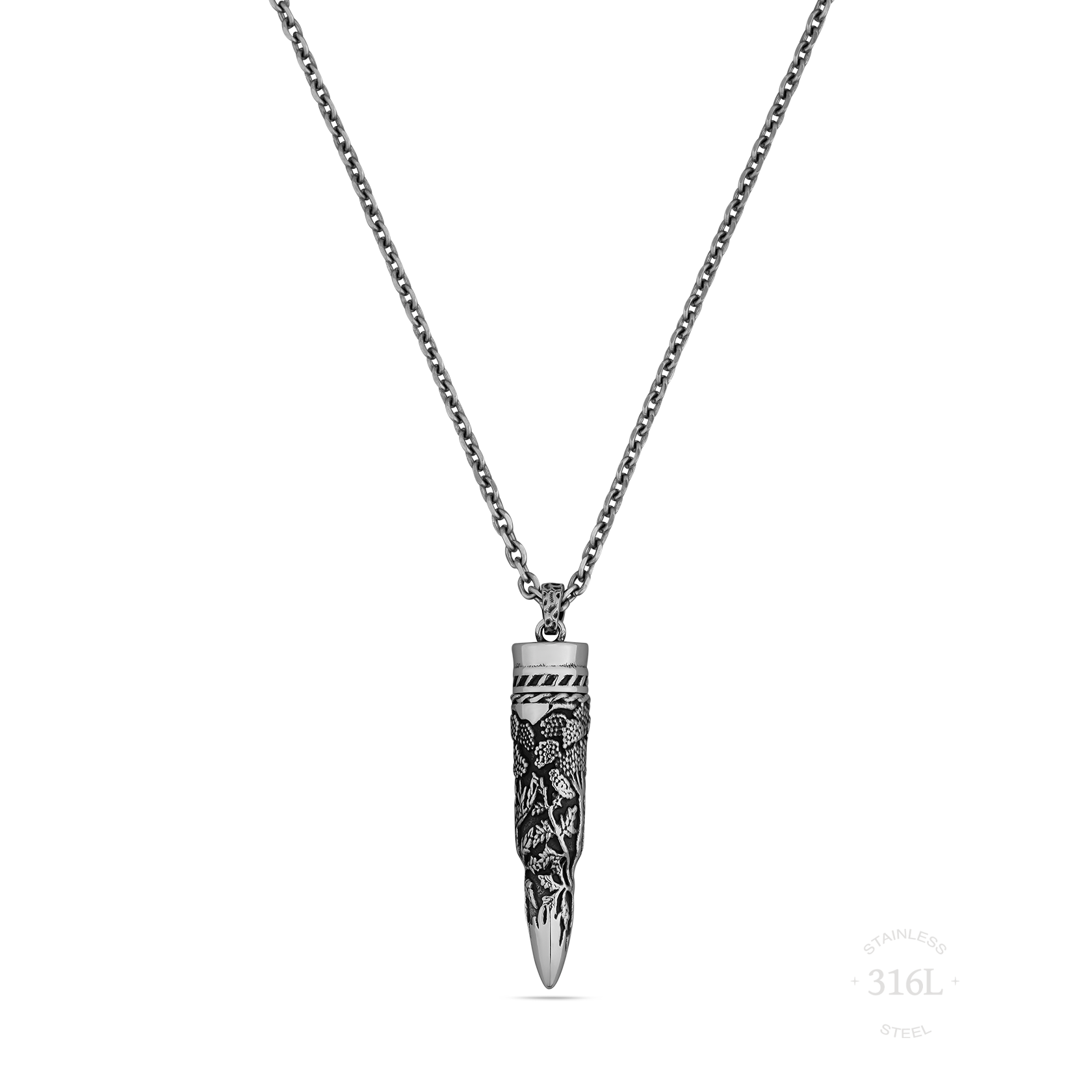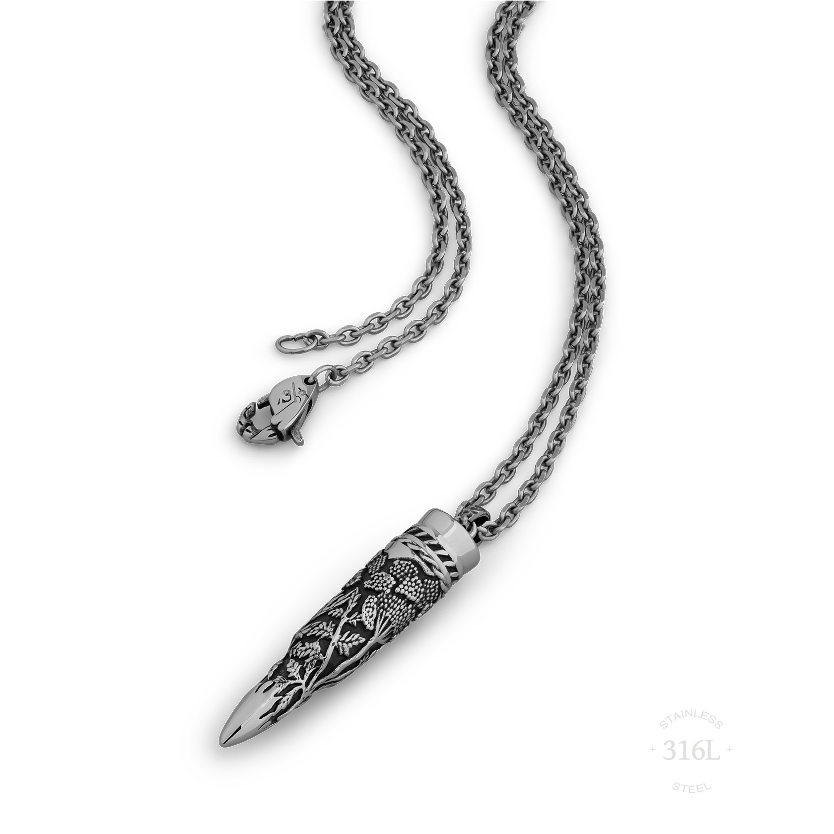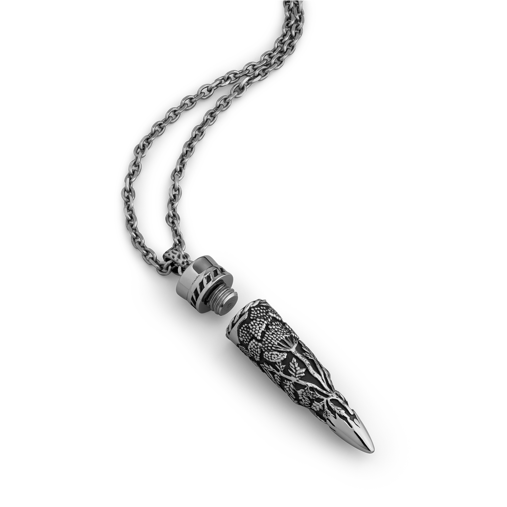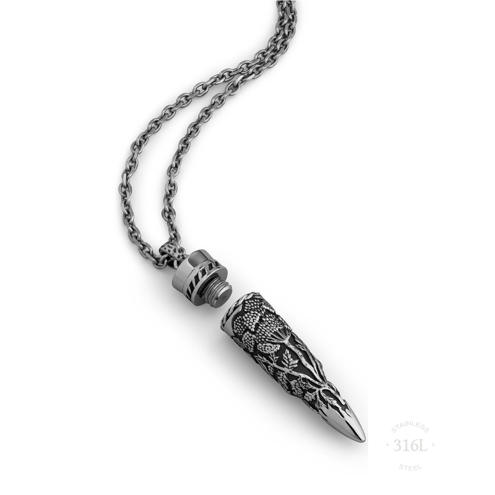 316 Stainless Steel pendant on a 55cm long x 3mm thick stainless steel chain necklace. Lid screws off to reveal a small container.