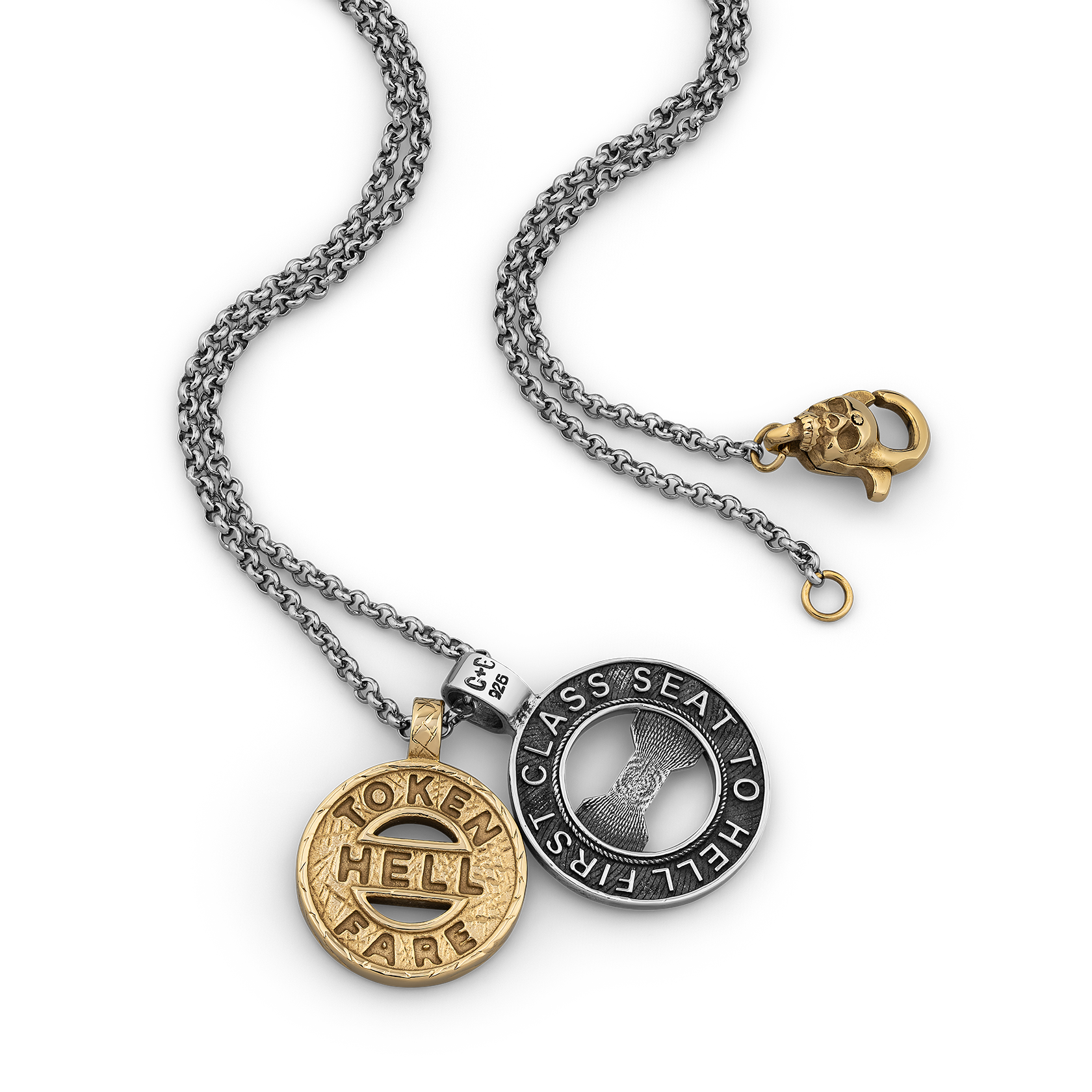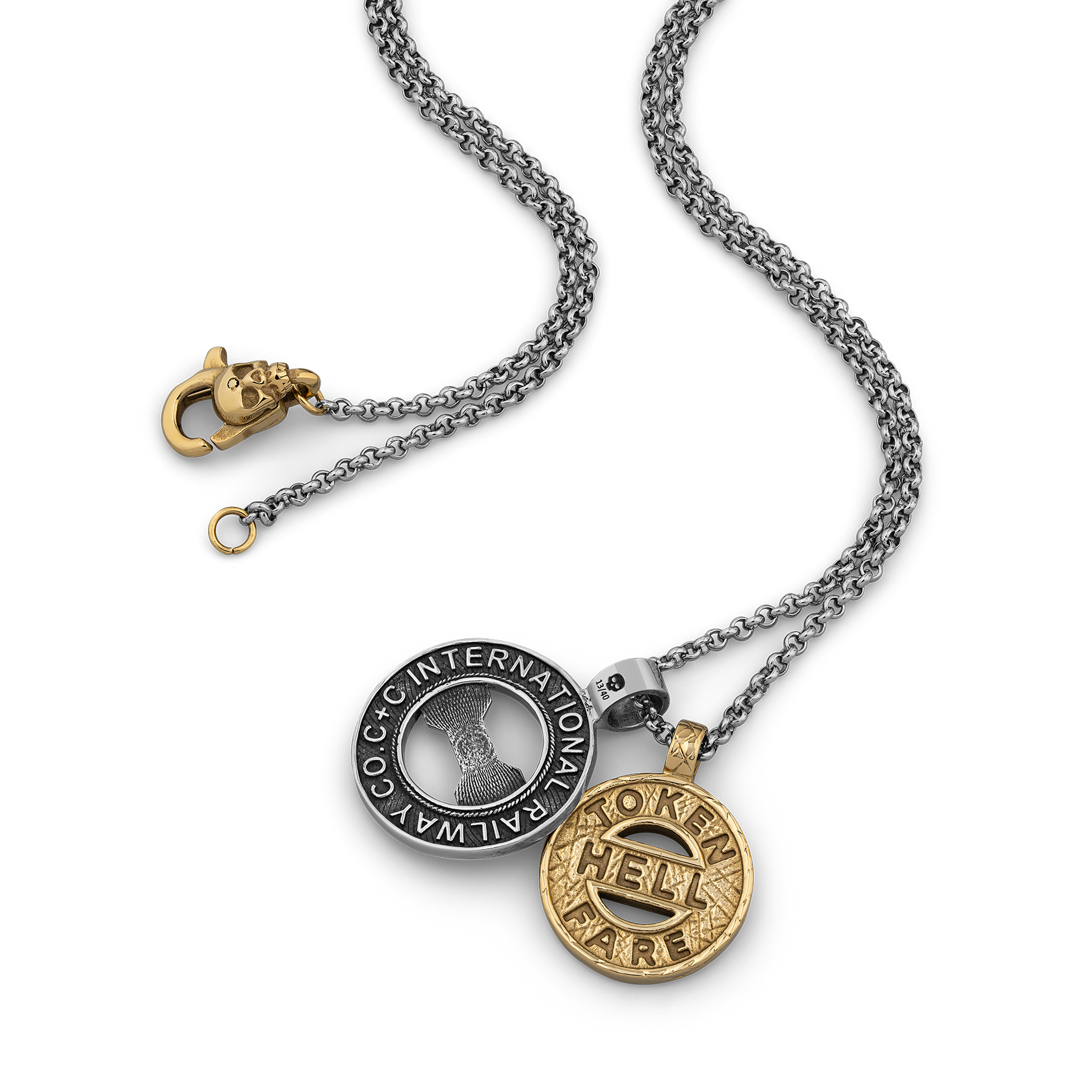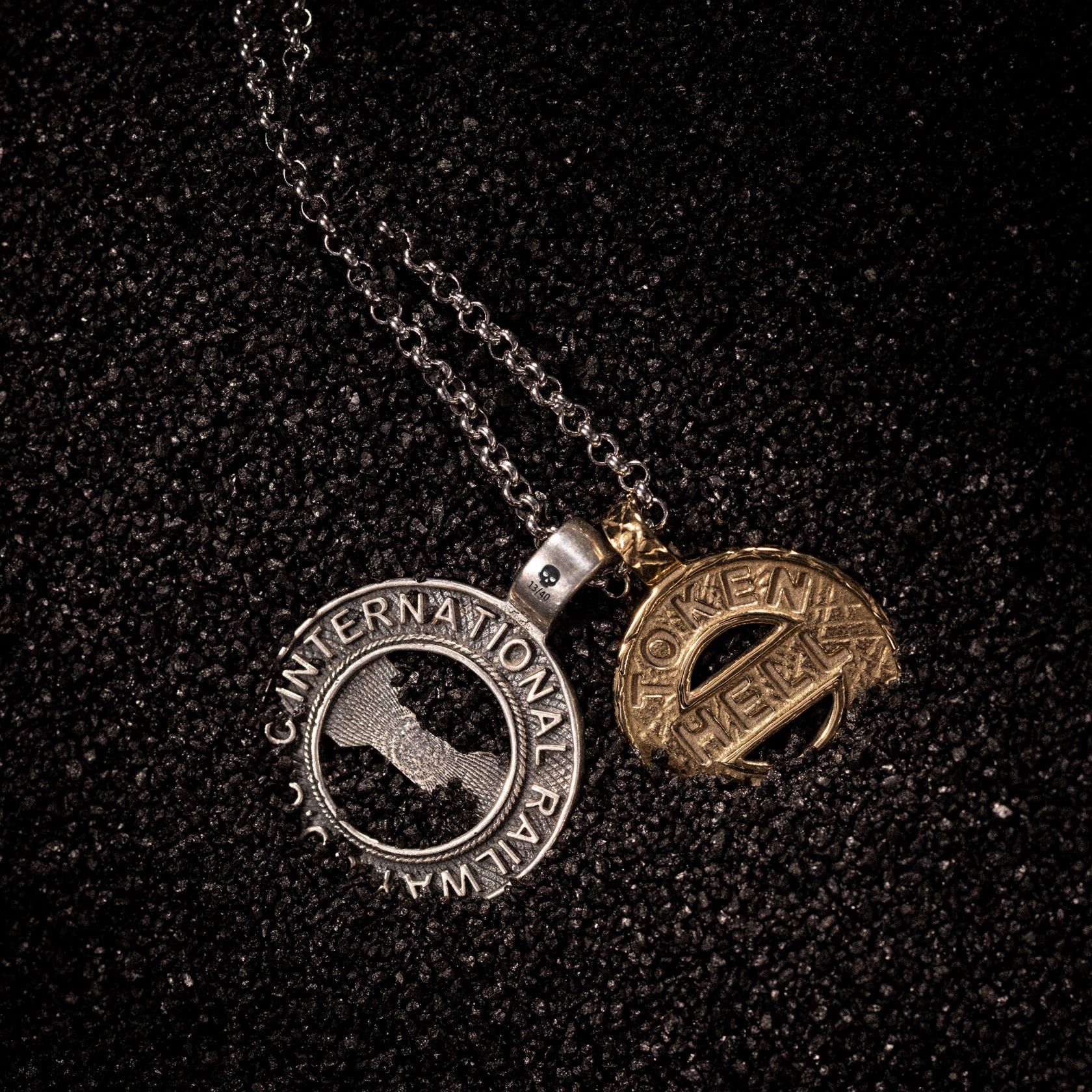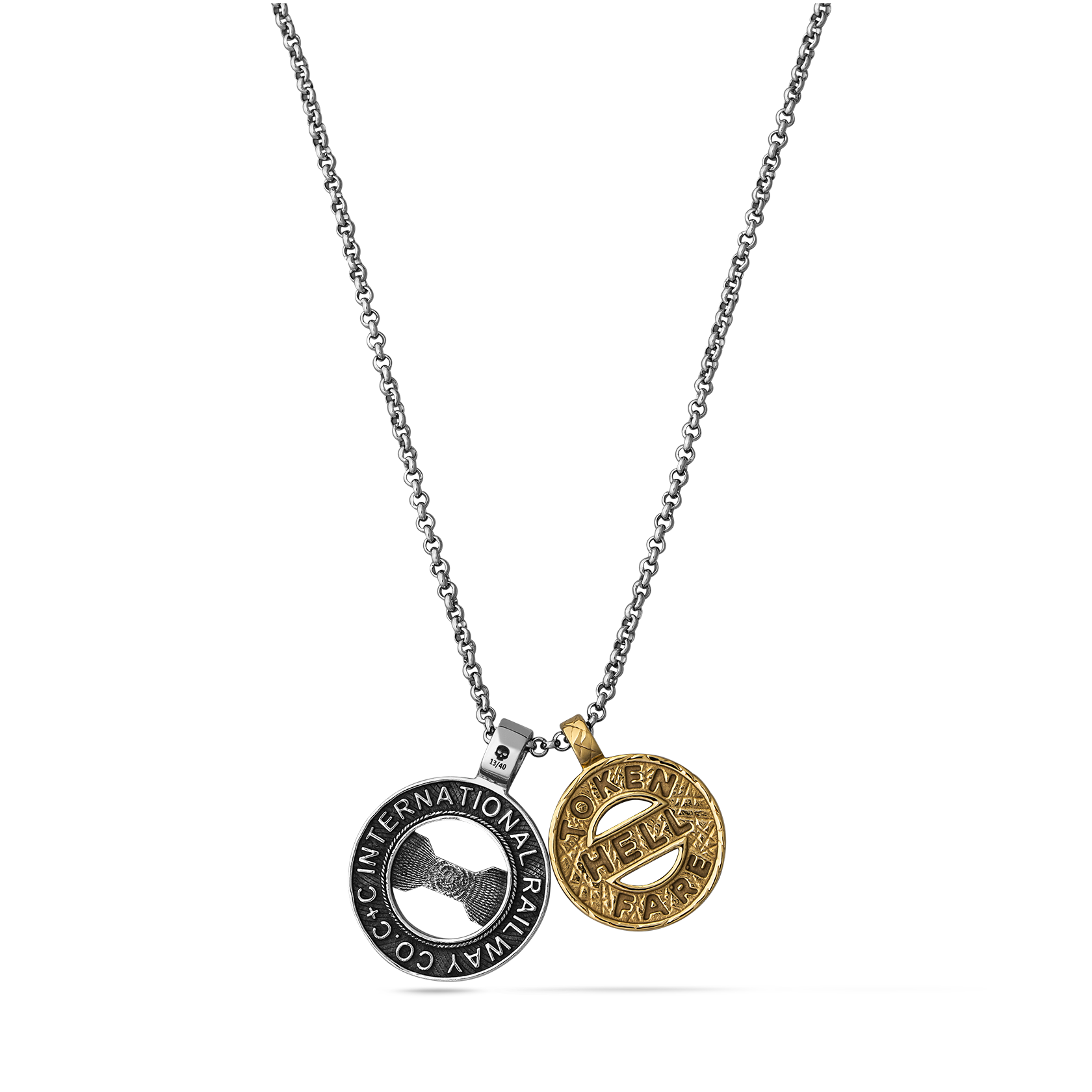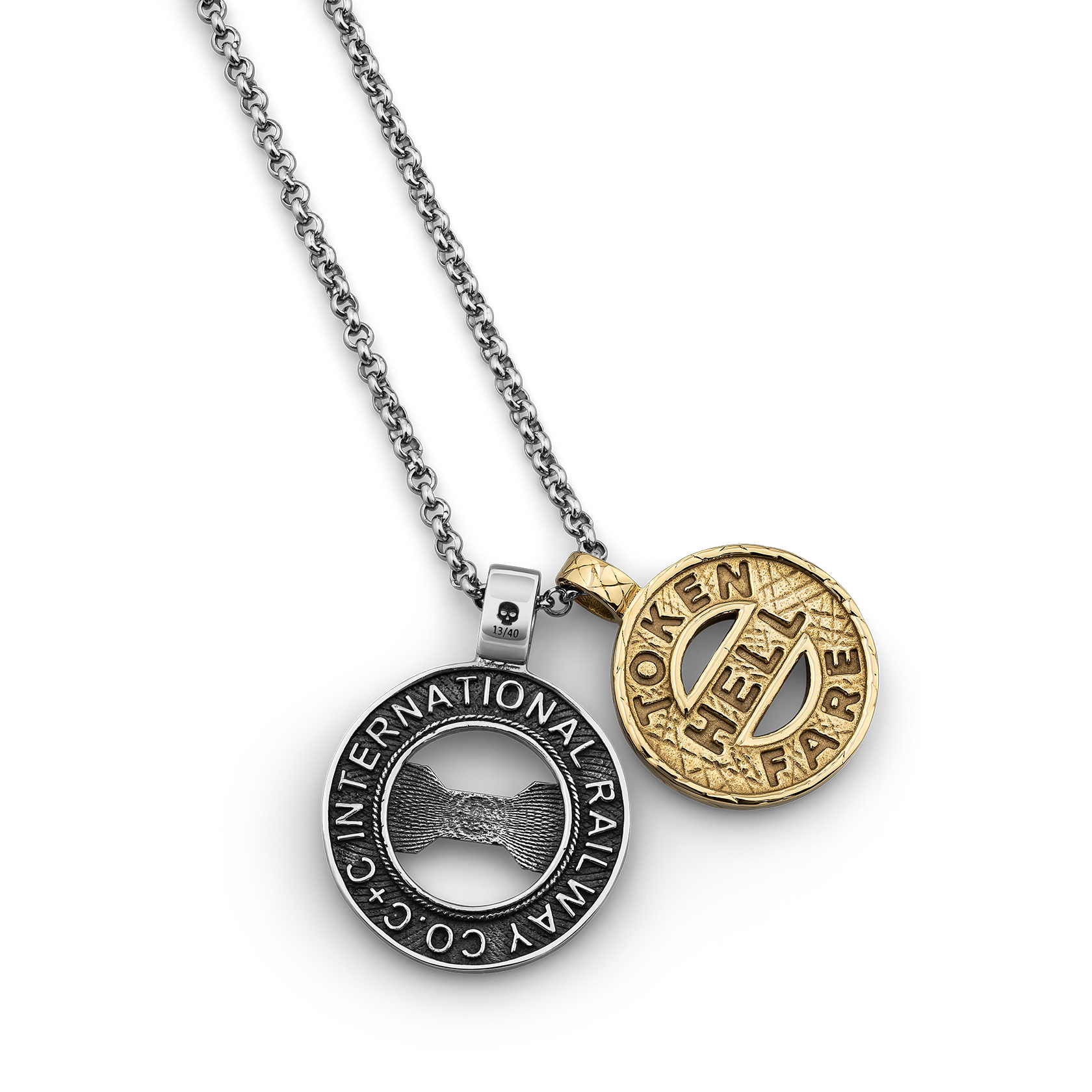 Sterling silver and brass pendants come on a 55cm X 2.5mm stainless steel cable chain with a custom brass skull clasp. Resurrected from our 2019 collection, Blood Train.