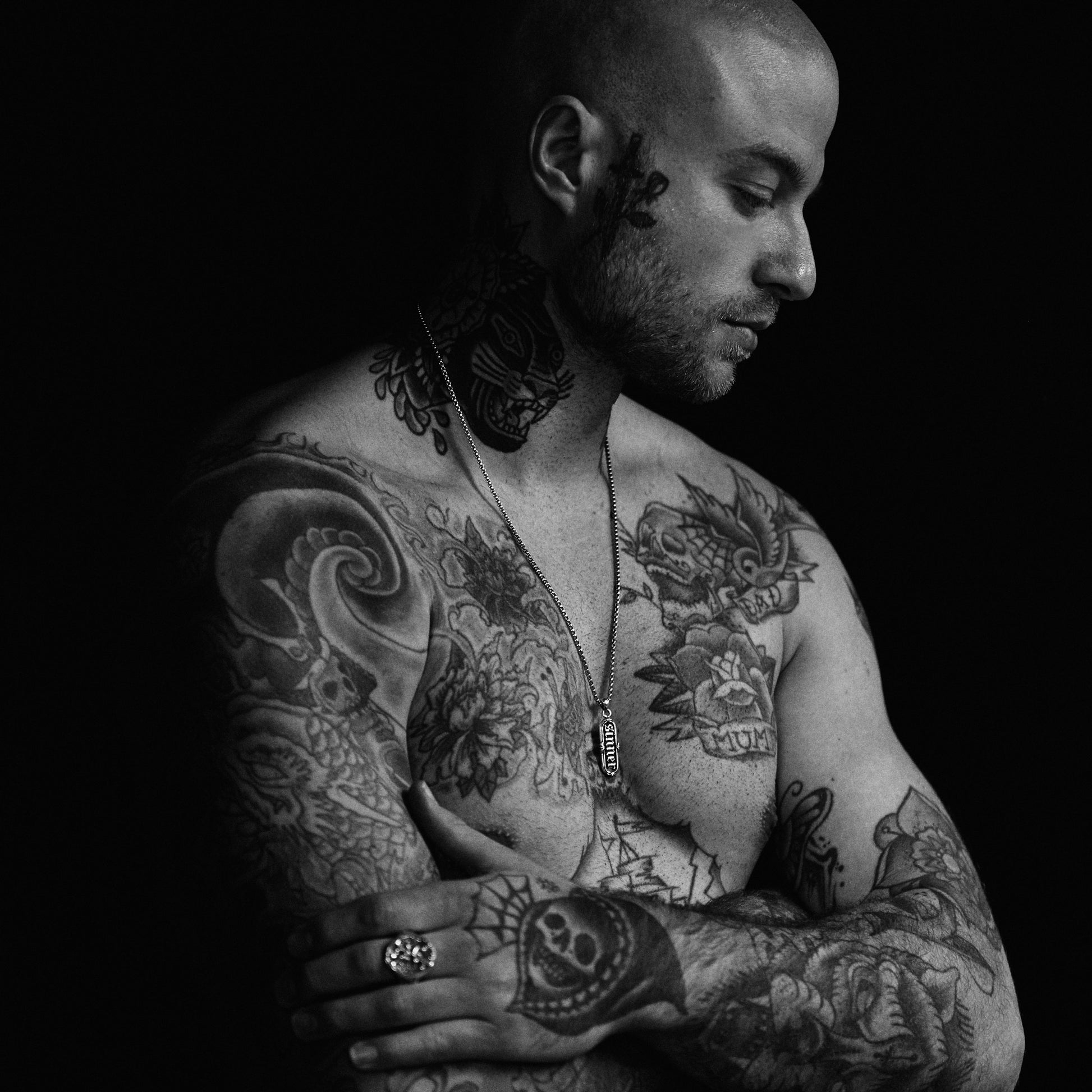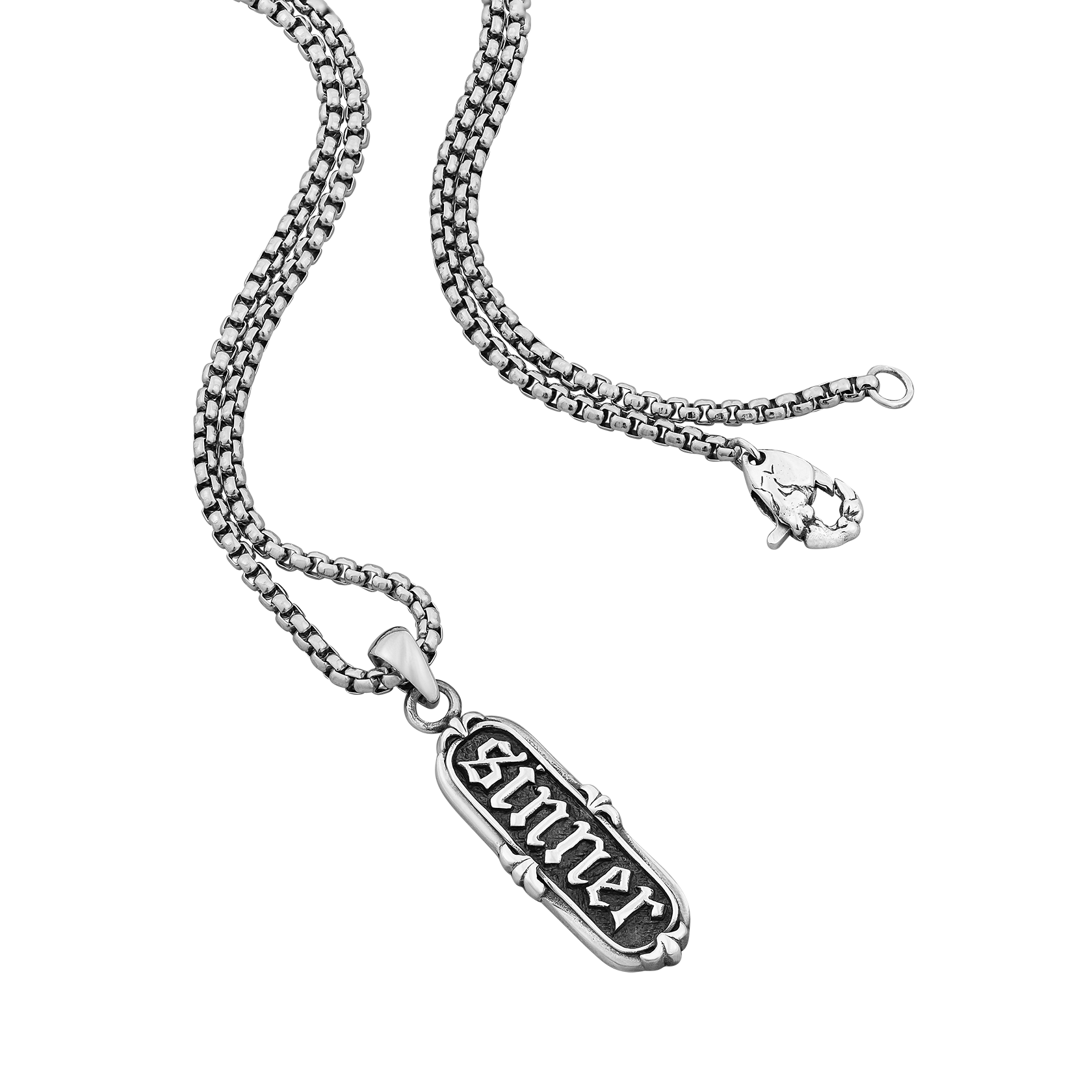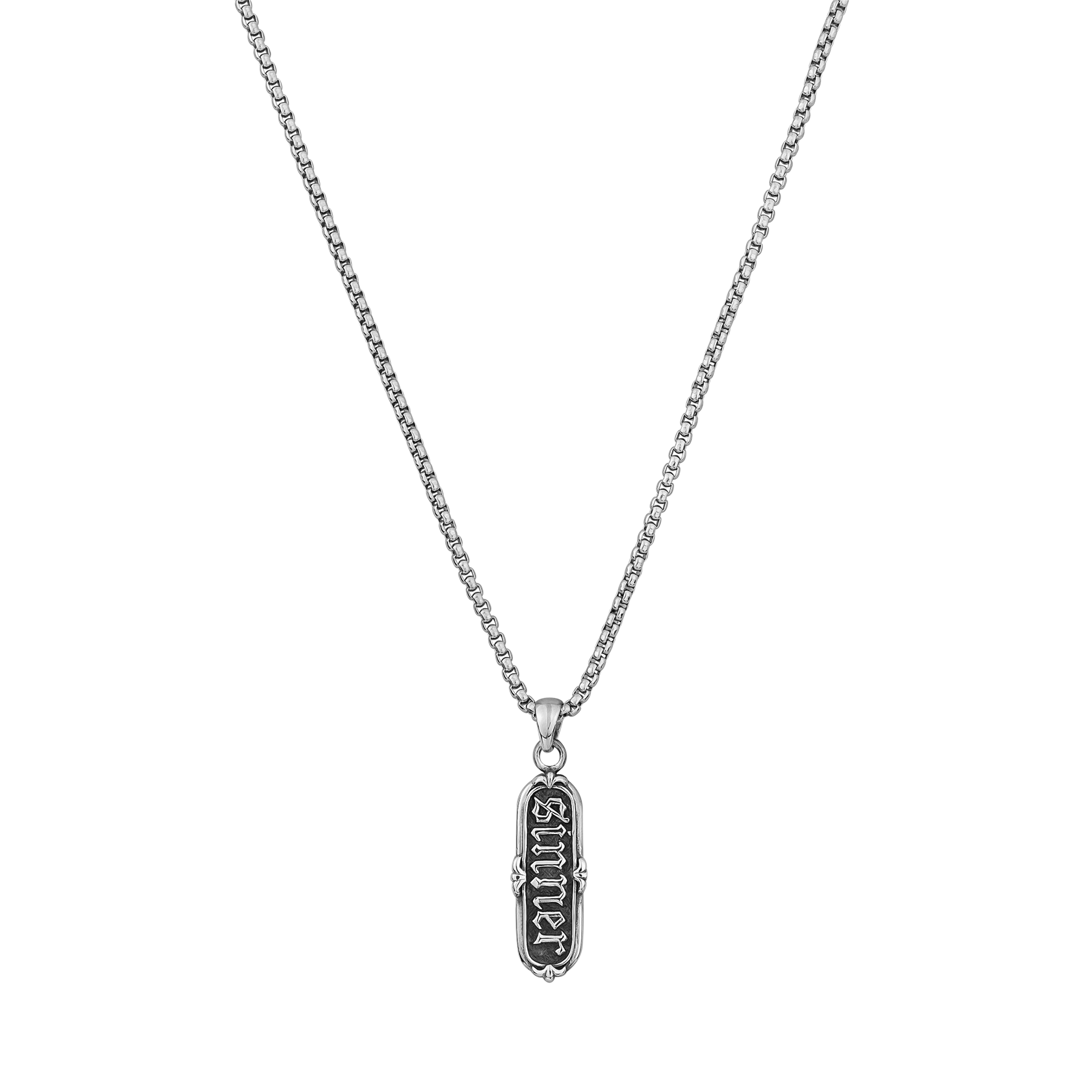 Designed in collaboration with Josh Russell, a British tattoo artist based in Chester, the Original Sin is a dog-tag style pendant emblazoned with a classic tattoo script and finished with an ornamental border. Pray for us sinners.