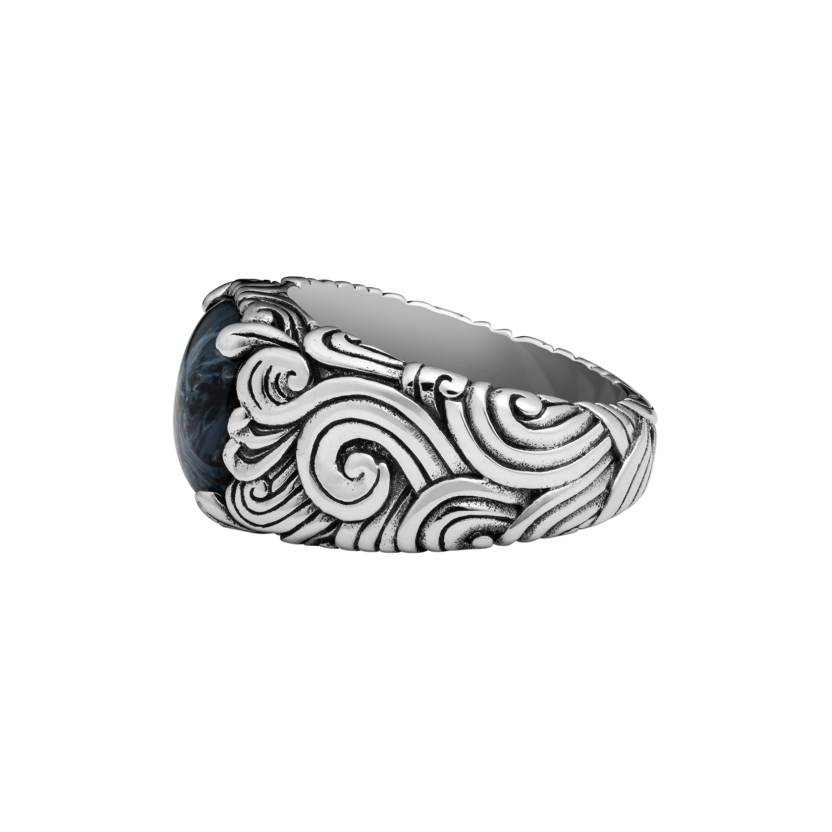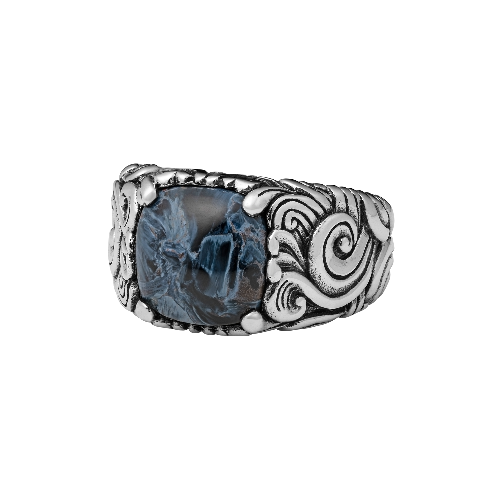 Featuring gusting winds and crashing waves, the centrepiece of this ring is a deep blue Pietersite stone—also known as the Tempest Stone for it's jagged, storm-like markings. This ring is for those with a tendency to steer towards choppy waters.