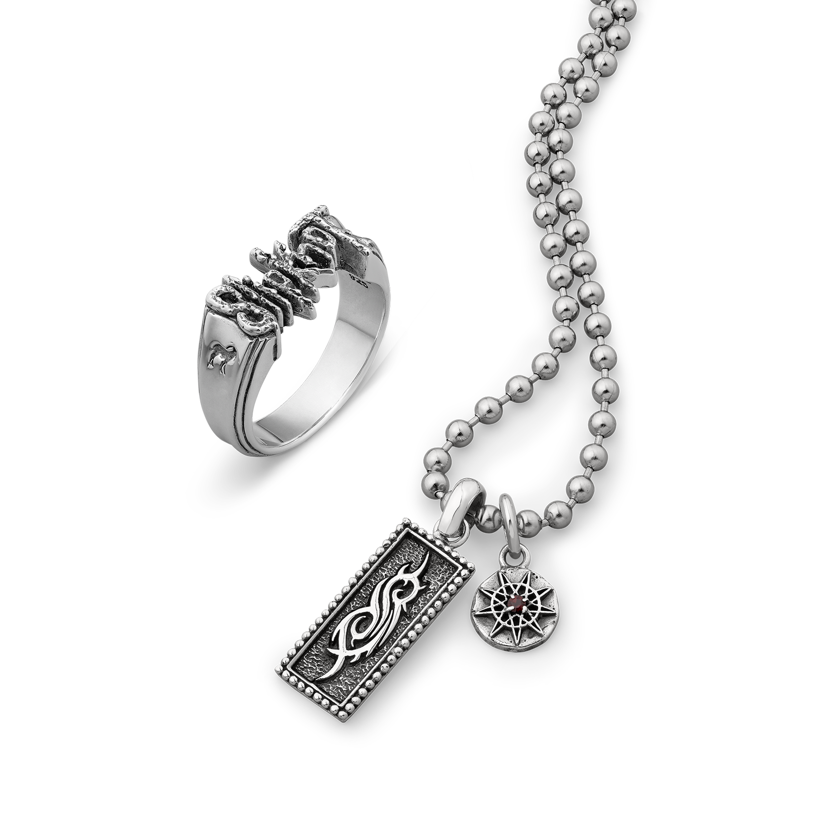 Handcrafted Sterling Silver Slipknot logo ring. Handcrafted Sterling Silver pendant with Red Garnet stone. Comes on a 50cm long x 4mm thick stainless steel ball chain.