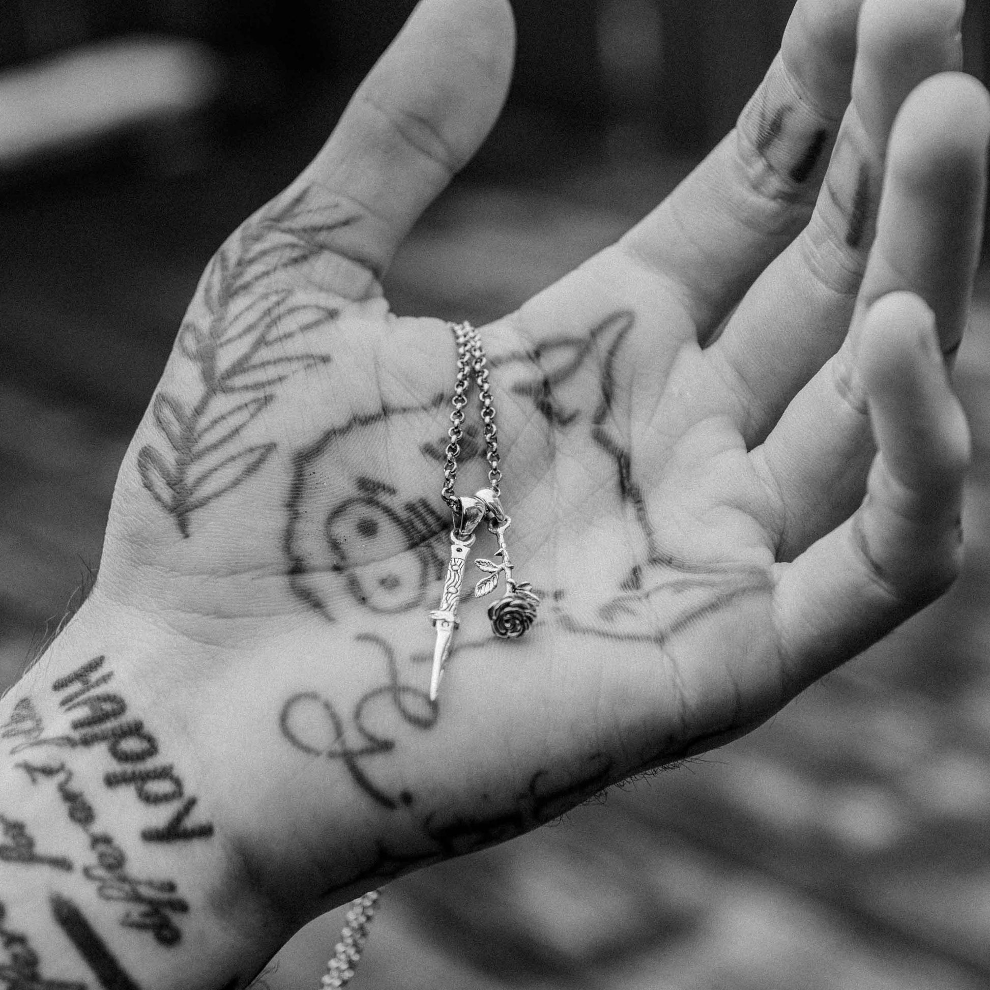 In collaboration with tattoo artist Sleestak, the Switchblade pendant pairs a rose with a gleaming blade—an ode to beauty with an edge. Crafted for those who know that every rose has its thorn, this piece speaks to the balance between strength and grace, held in perfect tension.