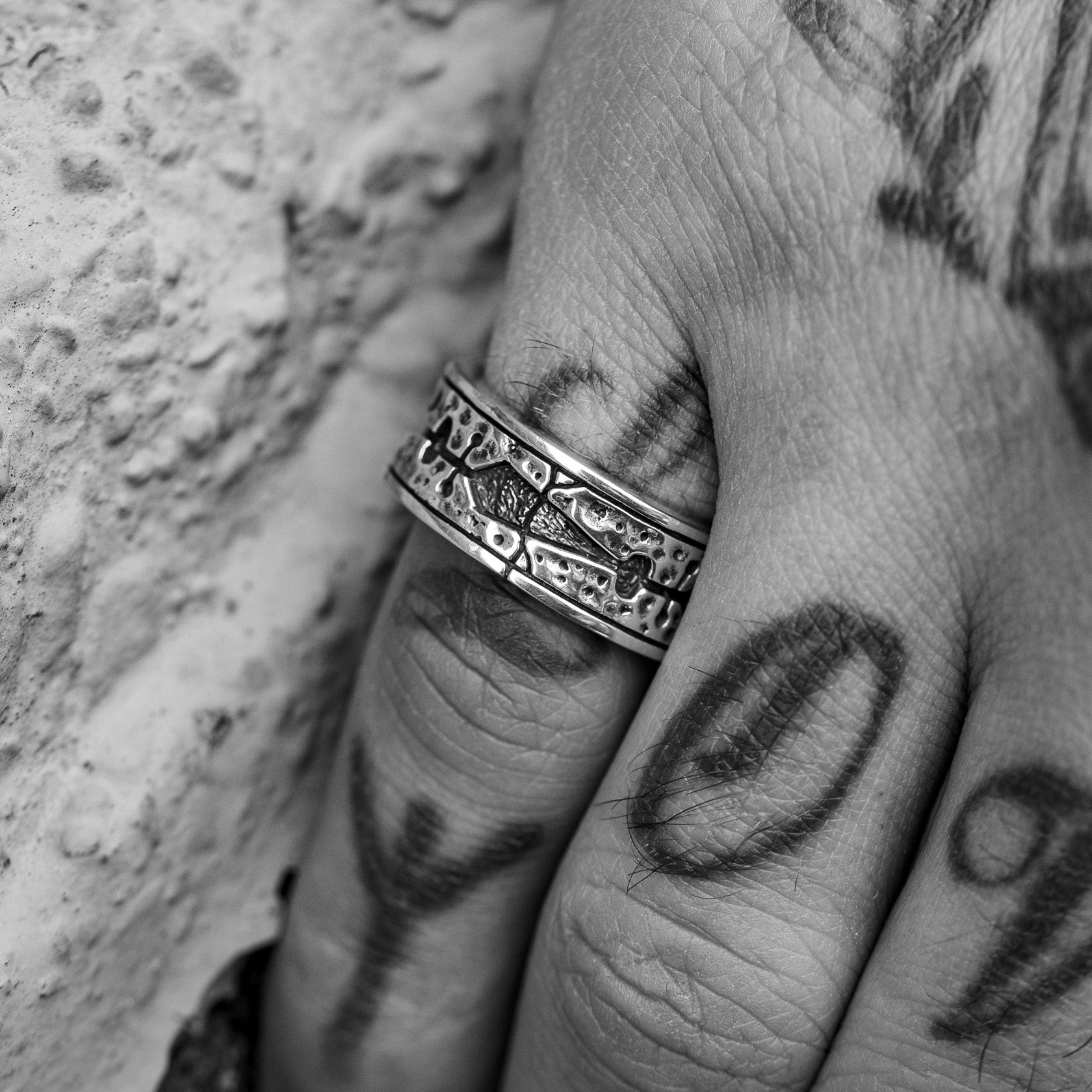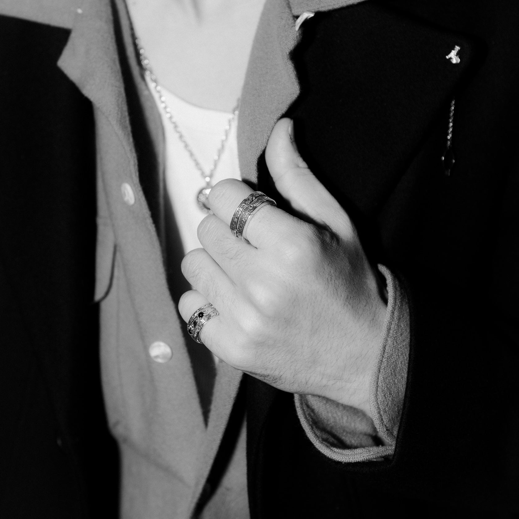 The Til Death ring is a pledge sealed in silver. Engraved with dagger silhouettes, it echoes the fierce, unbreakable connection between two souls. Love is a double-edged sword—strong and true, even when it cuts deep. Pair it with its counterpart or wear it as a silent vow.